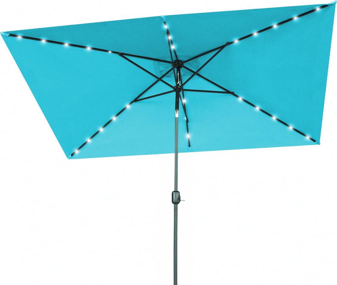 This rectangular solar LED patio umbrella measures 10′ x 6.5′ and provides plenty of shade on hot summer days. The canvas is 180G polyester so will stand up to the elements. Easy crank operation with a tilt option. Square solar panel at top means the LED lights last 9-12 hours (No electricity needed). Manufactured with superior quality by Trademark Innovations.