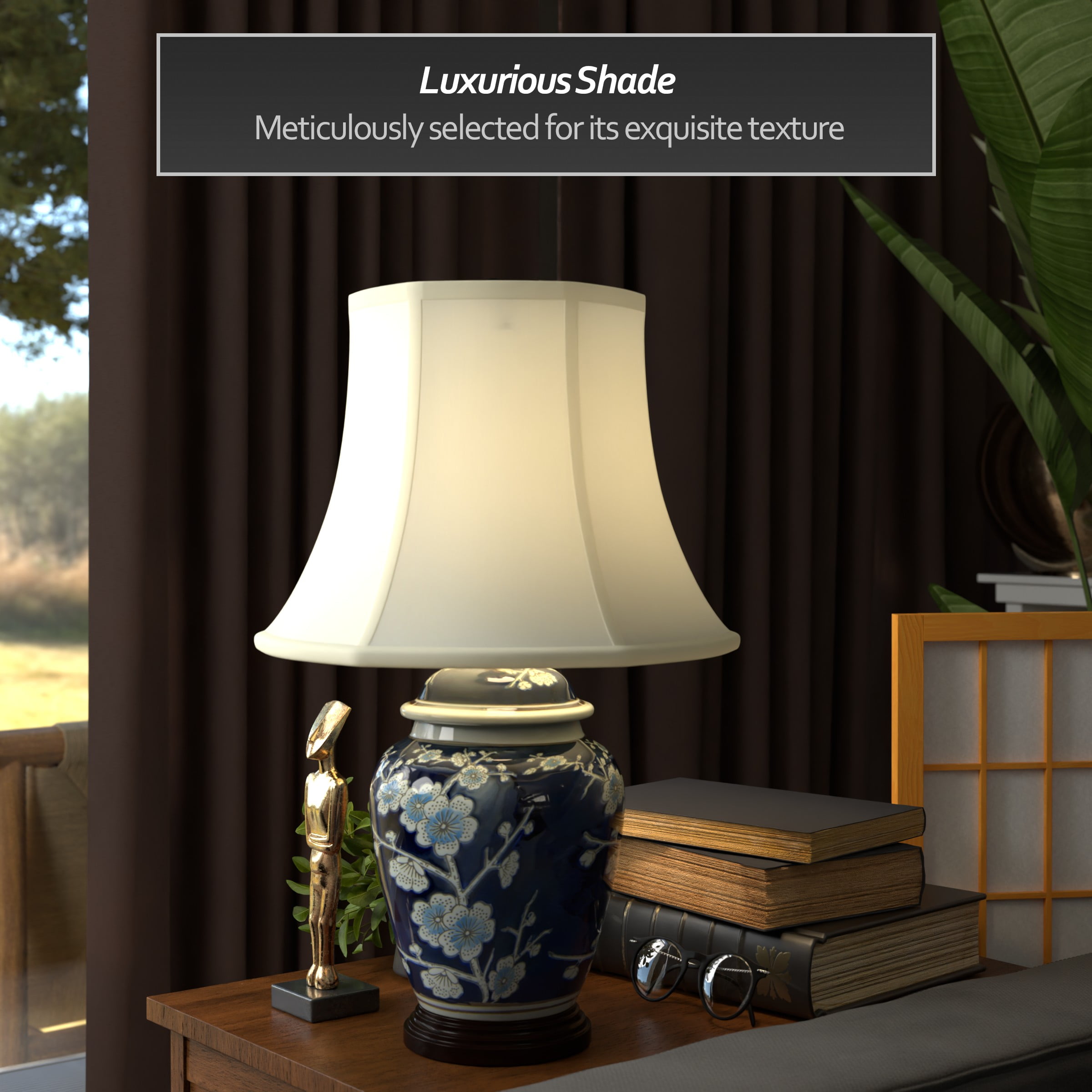 22″ Blue Cherry Blossom Lamp: Japanese inspired design with regal blue glaze Includes built in wooden base and a fabric shade Uses a 60W medium bulb (not included) Color: blue Material: porcelain, fabric