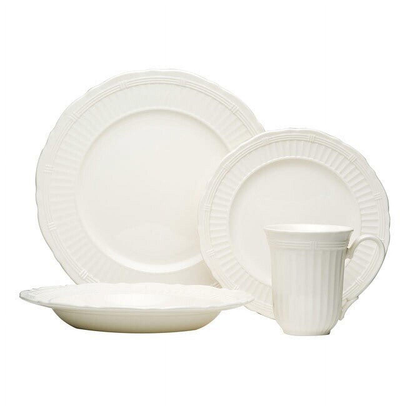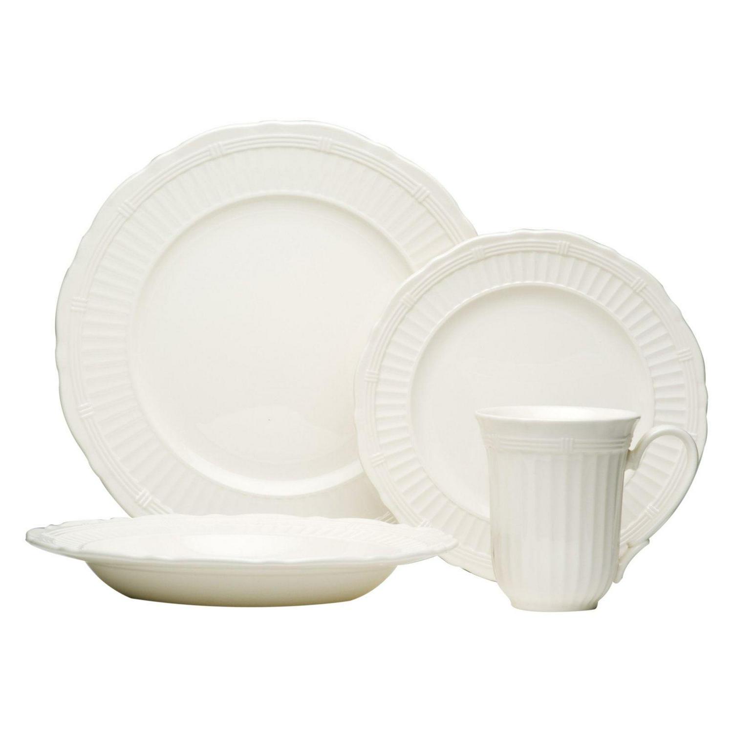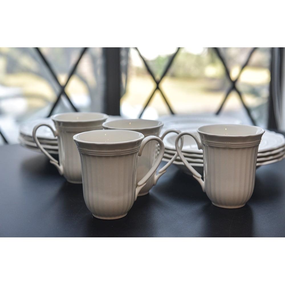 Every color goes with white, so any dish you prepare will look delicious on the Red Vanilla Tuscan Villa 16 pc. Dinner Set. The embossed design of this traditionally themed set will be right at home in any kitchen, and the creamy white stoneware is durable enough for everyday use and is dishwasher-safe. Each of the four place settings includes a dinner plate, salad plate, mug, and soup bowl.