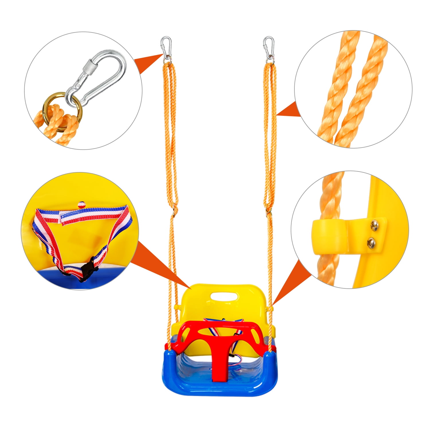 REDCAMP 3-in-1 Infants to Teens Swing for Indoor Outdoor 【3-In-1 Design】The kids swing has the design of combination of 3-in-1 which meets enough demand for your kids’ growth. Detachable handrail and backrest. Great Playground Accessory for infant toddler children teens 【SAFE Enough】The front T handlebar and the seat back which features a belt attached for keeping your child in right position ensure the safety. 4 nylon ropes are attached to the seat to evenly distribute the weight, and the special design of the buckle for nylon rope protects the swing from tipping and provides a comfortable grip and eliminate any pinching of toddlers fingers 【Adjustable Height】The swing is easy to adjust the length of the hanging rope according to your needs. This will save your a lots of troubles to find a suitable place to install 【Easy to Install】This detachable swing includes everything you need for assembly and installation. Two FREE tree straps and hooks are included. You can add the toddler swing seat to a tree, swing set, jungle gym or indoor. 【IDEAL GIFT】Our Baby Swing Seat Toddler Swings for Outside Swing Set provides fun and entertainment for your kids! It’s a great gift option for kids’ school classroom prizes, gift exchange, various activities, birthdays, and more! Specifications: Load Capacity: 220lbs Material: Polypropylene, Nylon Adjustable Height:43.3”-75” Swing Set Accessory Type: Comes with Two FREE tree straps & Two FREE Hooks