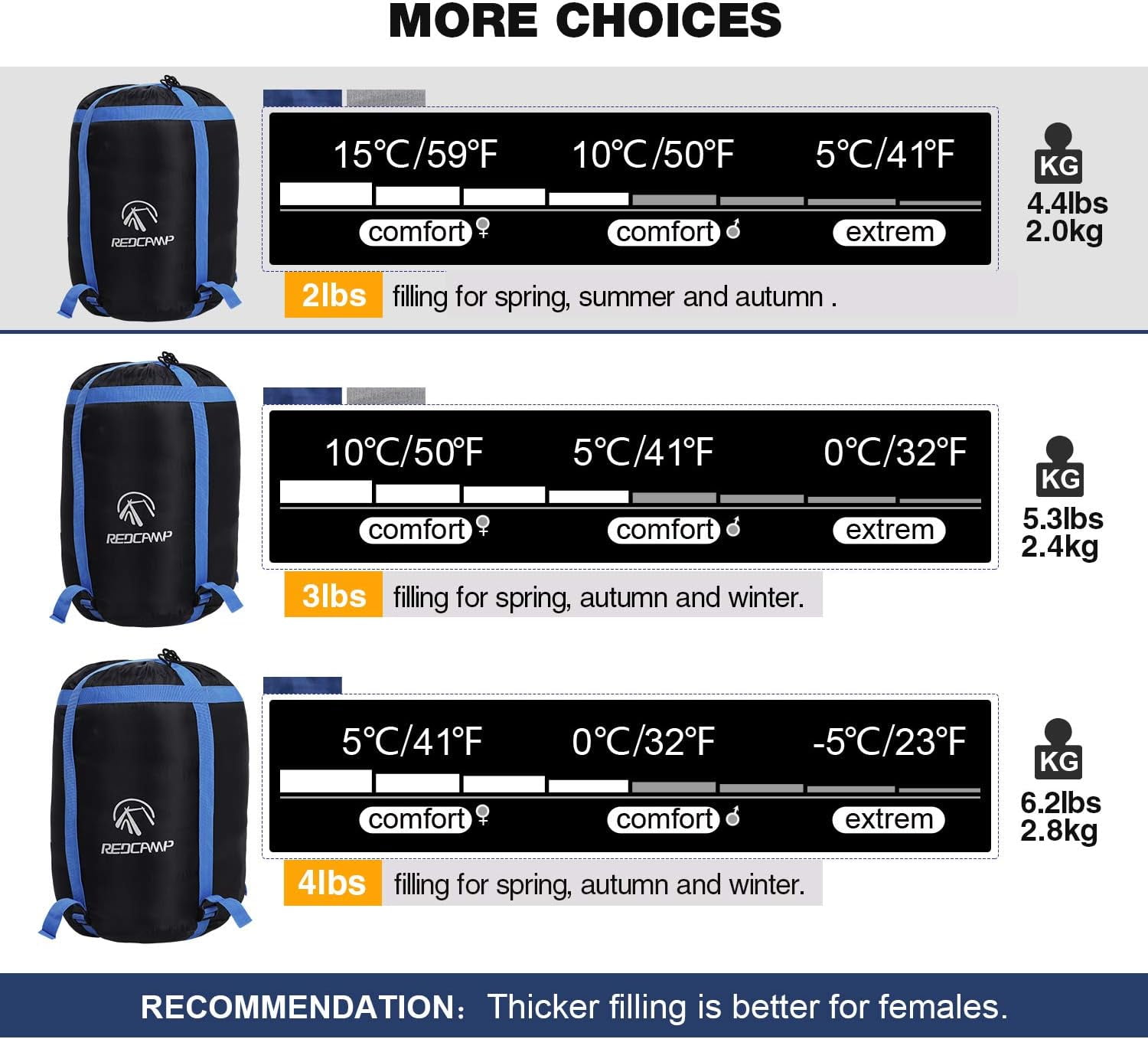 Click Here ✈ for Rectangle Sleeping Bag Click Here ✈ for Double Sleeping Bag A PERFECT OUTDOOR TRIP STARTS FROM REDCAMP. The REDCAMP sleeping bags are great for both in- and outdoor activities. With the compression bag, the adult sleeping bags are easy to carry and can be used for camping, hiking tours, self-driving tours, fishing and other outdoor activities. So feel free to BUY your own sleeping bag and don’t forget your family and friends! Why This Sleeping Bag? Backpackers have waited decades for a soft, comfortable, warm, durable water repllent sleeping bag. Pick up your flannel sleeping bag today for a rugged but comfortable camping or backpacking experience. When cinched with a drawcord, a hood prevents heat from radiating away. Made by 100% cotton flannel lining, the cotton flannel sleeping bag is quite soft, comfortable and skin-friendly. Outer polyester rip stop fabrics, durable and waterproof, hollow cotton filling offers enough warmth. It can help you to get rid of a tiring day of hiking, camping, backpacking and travel. The Hood design offer extra protection for the head. The camping sleeping bag include a convenient compression sack with strap, can be easily roll up and stuff into the compression sack with a compact size. Weighs only 4Lbs, the hiking sleeping bag is quite lightweight and convenient for your adventures. With a 2 way zipper system, you can zip yourself into the warmth of your thermal sleeping bag easily and quickly. Two sleeping bag can be zipped together to a double sleeping bag. The convenient double-sided zipper also allows for closure while lying inside. The XL sleeping bag measures at 90.6’’ x 35.4’’ (including the length of hood), which ensures you to move freely in it. The zipper with separated bottom zipper can let you stick your feet out. The sleeping bag for camping is designed to keep you warm all night, suitable for cold weather and warm weather on spring, summer, fall or winter.