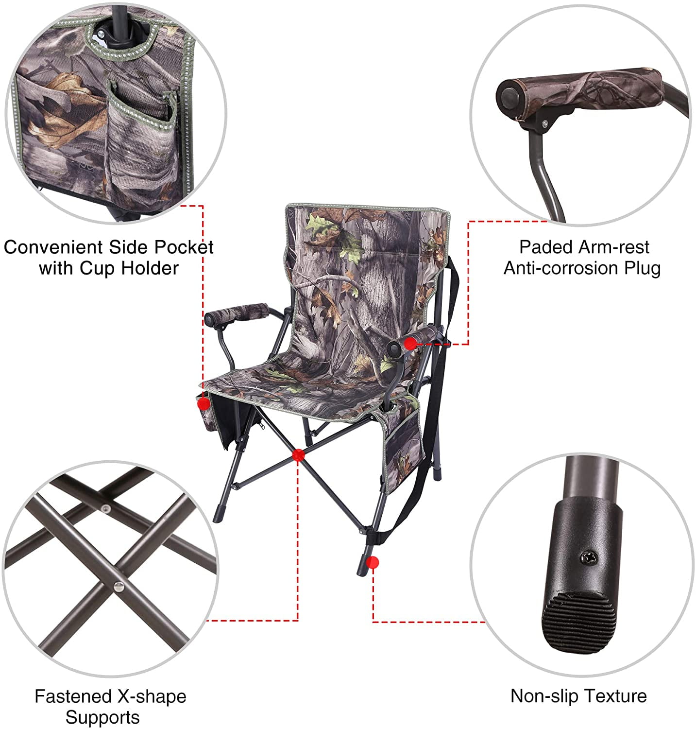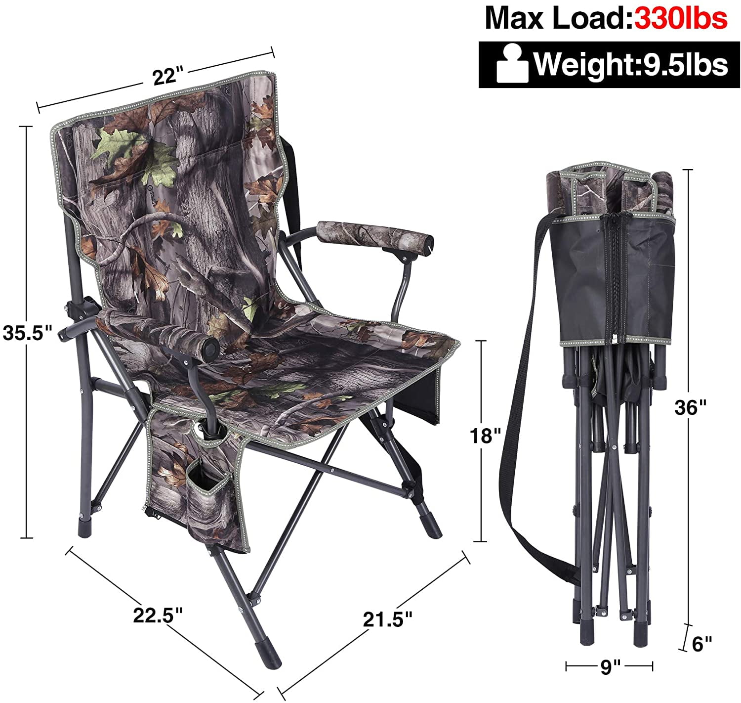 REDCAMP Heavy Duty Folding Camping Chair X-support Frame: The frame of this portable chair has a design of fastened X-shape supports which is stable and can hold up to 330lbs. Convenient Side Pocket: Our portable camo hunting chair is designed with convenient side pockets at both sides. It makes you easy to access your drinks or personal belongings. Premium&Durable Fabric: REDCAMP adult camping chair is made of 600D PVC fabric which is wear resistant and can last for many years. Padded Armrests: The foldable chair have padded armrests with anti-corrosion plug which make it more comfortable to get in and out of seat. Easy to Setup and Fold: No tools required. you can set up and fold this outdoor chair in seconds. With a convenient storage bag, you can carry it to anywhere you want easily. Specifications: Color: Camouflage Weight: 9.5 lbs Weight Capacity: 330 lbs Overall size: 21.5″ W x 22.5″ D x 35.5″ H Seat Height: 18″ Material: 600D oxford fabric, padded seat and Alloy steel frame Recommended Use: Camping, Hiking, Hunting, Fishing, Picnic, Beach and Other Outdoor Activities. Also suitable for using at home.
