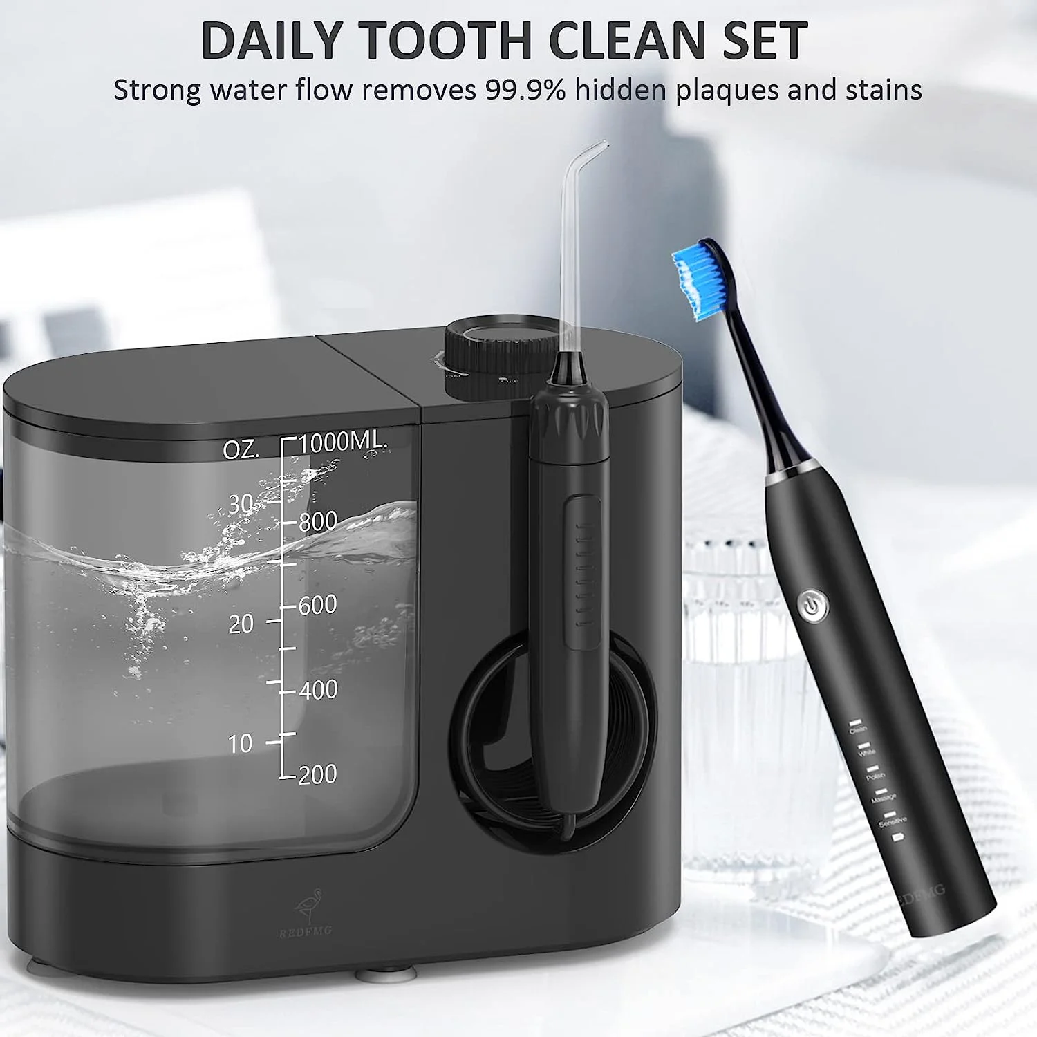 REDFMG Water Flosser & Electric Toothbrush Set – 1000ML Detachable Water Tank Electric Water Toothbrush ,7 Jet Tips & 4 Brush Heads, IPX6 Waterproof