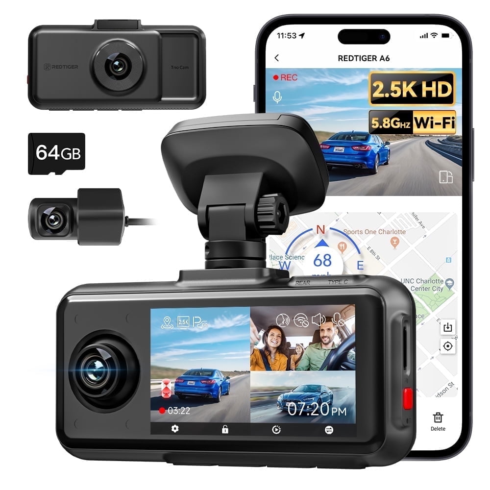 REDTIGER A6 Dash Cam Front and Rear, 4K/2.5K+1080P 5.8G WiFi & GPS dashcam, 3 Channel dash Cam with 64GB Card, 2.5K+1080P+1080P Dash Camera for Car, Super Night Vision, Loop Recording, Parking Mode