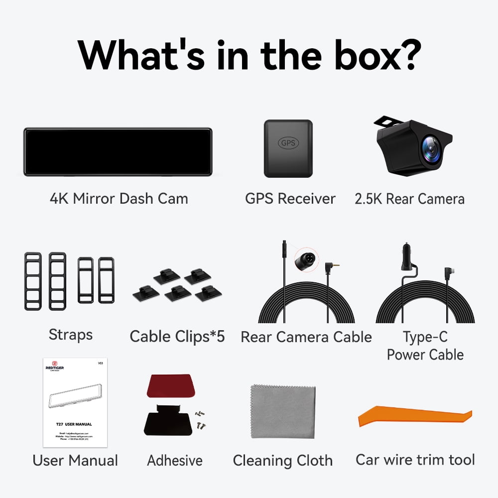 REDTIGER T27 Rearview Mirror Dash Cam, 11″ UHD Full Touch Screen Rear View Mirror Dash Camera for Cars, 4K Front and 2.5K Rear Dash Camera with Night Vision GPS , Free 32GB Card The REDTIGER T27 Rear View Mirror Camera for Cars is a Top-of-the-Range 11″ UHD Full Touch Screen Rearview Mirror Dash Camera that boasts a resolution of up to 3840x2160P (Front 4K) and captures crystal-clear video and image. This Dual Dash Cam, ensures that important details are captured in sharp and clear videos, even in extremely low light conditions. The smart mirror camera is equipped with multiple functions, including touch screen operation, split screen, parking monitoring, collision detection, GPS positioning, and parking assistance. Its 32GB card and 2.5K Rear Mirror Dash Cam Backup Camera provide ample storage space for recorded footage. This 4K+2.5K Stream Media Rear View Mirror Dash Cam is ideal for smart driving, and is a testament to REDTIGER’s mission to constantly explore and focus on innovative solutions. Please contact REDTIGER support team for any help. ✨【Hardwire Kit Link】 REDTIGER Muti-Size Hardwire Kit for Dash Cam, USB C Port(Type-C Port)[ Click Here ] Note: We recommend purchasing our original hard-wired kit to avoid mismatching with the dash cam. The products currently sold are USB C ports. If you need to purchase a hardware kit, please click on the link to purchase.