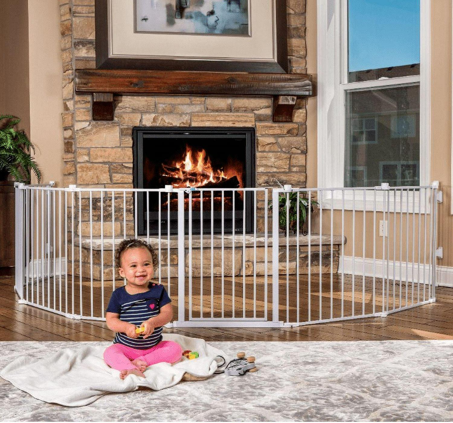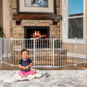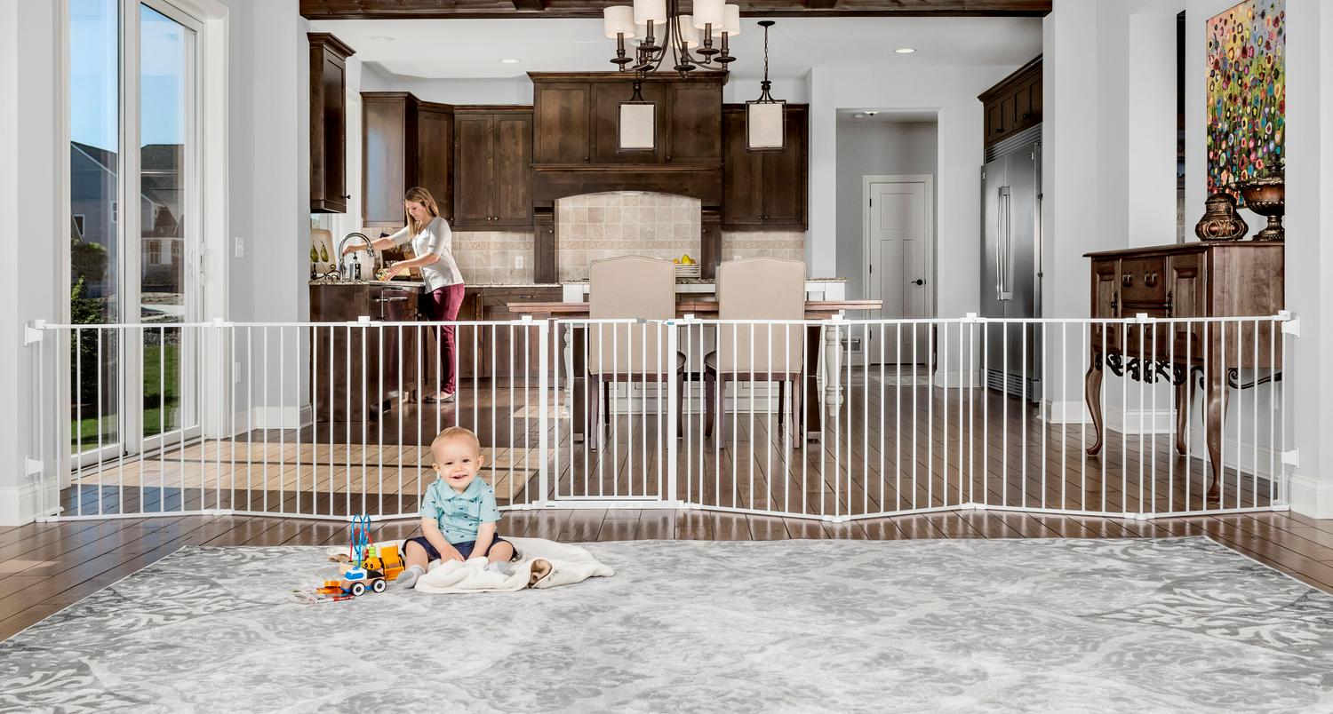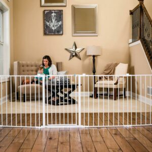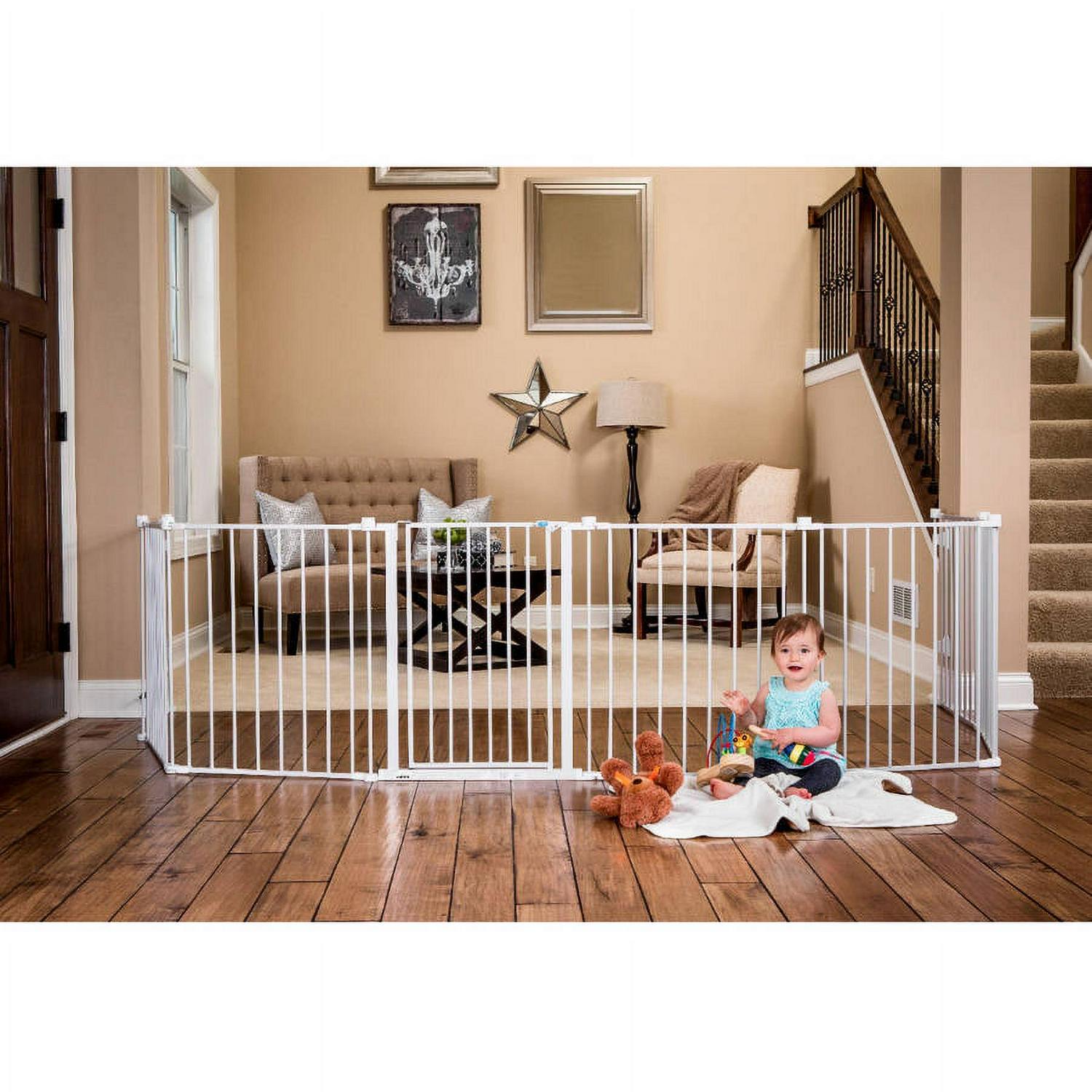 Once your little one starts walking, child proofing your home is a must. Providing a versatile way to keep your child safe, the Regalo Super Wide Baby Gate and Play Yard offers numerous convenient configurations for around the house. This play yard and safety gate features durable all-steel components and a hardware-mount system ideal for large, angled or uneven openings. The super wide gate can be expanded to fit openings up to 192 inches and comes with eight, 24 inch panels. It is ideal as a play yard, fireplace barrier, at the landing of stairs, or a super gate for very wide openings. Minimum opening for this gate is 50.5 inches.