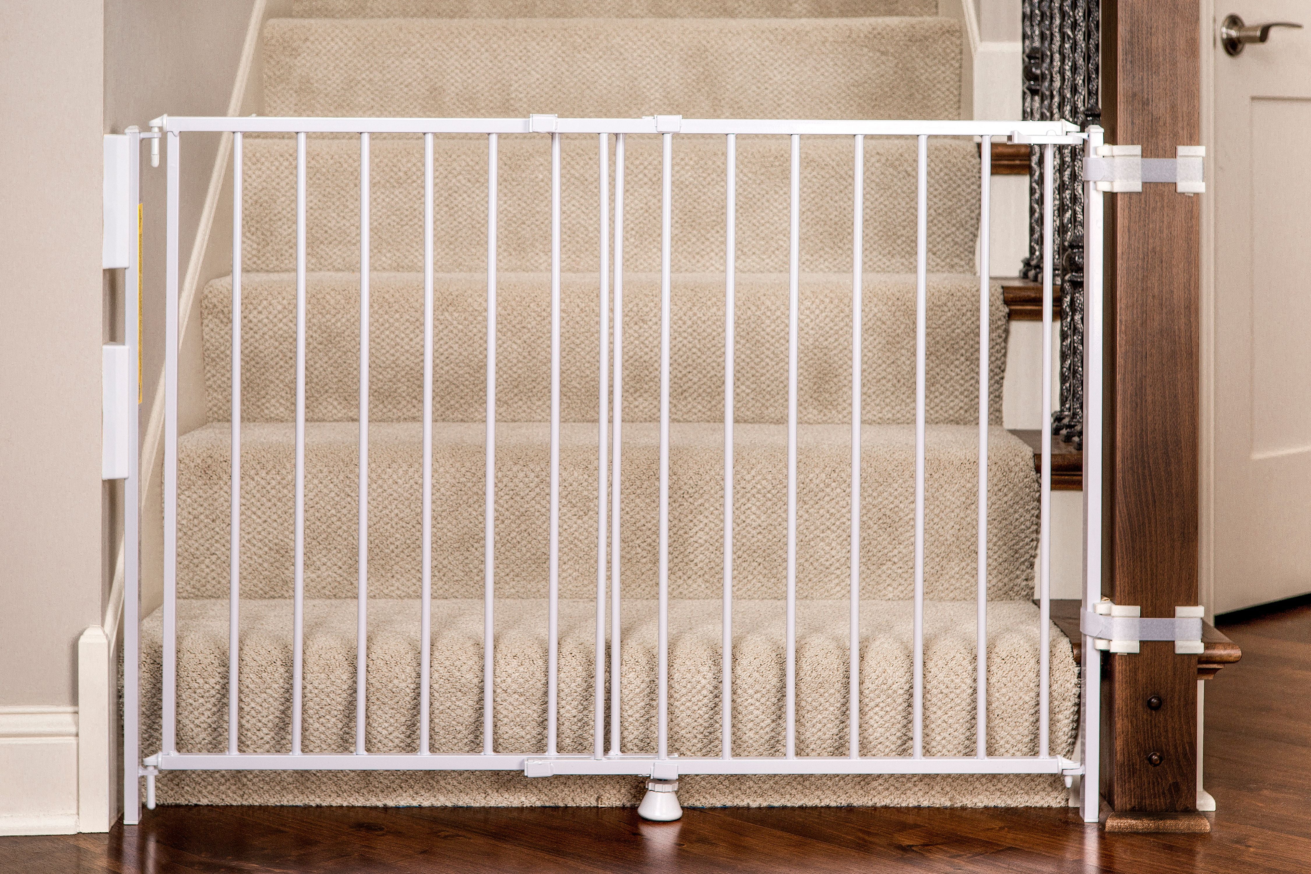 EXTRA WIDE: Expands to stairways and openings between 29-43 inches wide. Stands 30.5 inches tall. Wall mounted gate. VALUE BUNDLE: Includes gate, mounted level poles, banister corner protectors (16), square banister adapters (4), plastic wall spacers (6), round banister adapters (1), and wall mounting hardware ADJUSTABLE: Perfect for doorway, hallway and top or bottom of stair use. Gate can quickly be removed out of the opening for easy storage.Wipes clean DURABLE AND CONVENIENT: The all steel design is durable and convenient with a walk-through door. Please see PDF user guide for set up assistance. SAFETY: Designed with safety-lock, meets all safety standard. Hardware mounted added security. Perfect for children 6-24 months. Great for pets too.