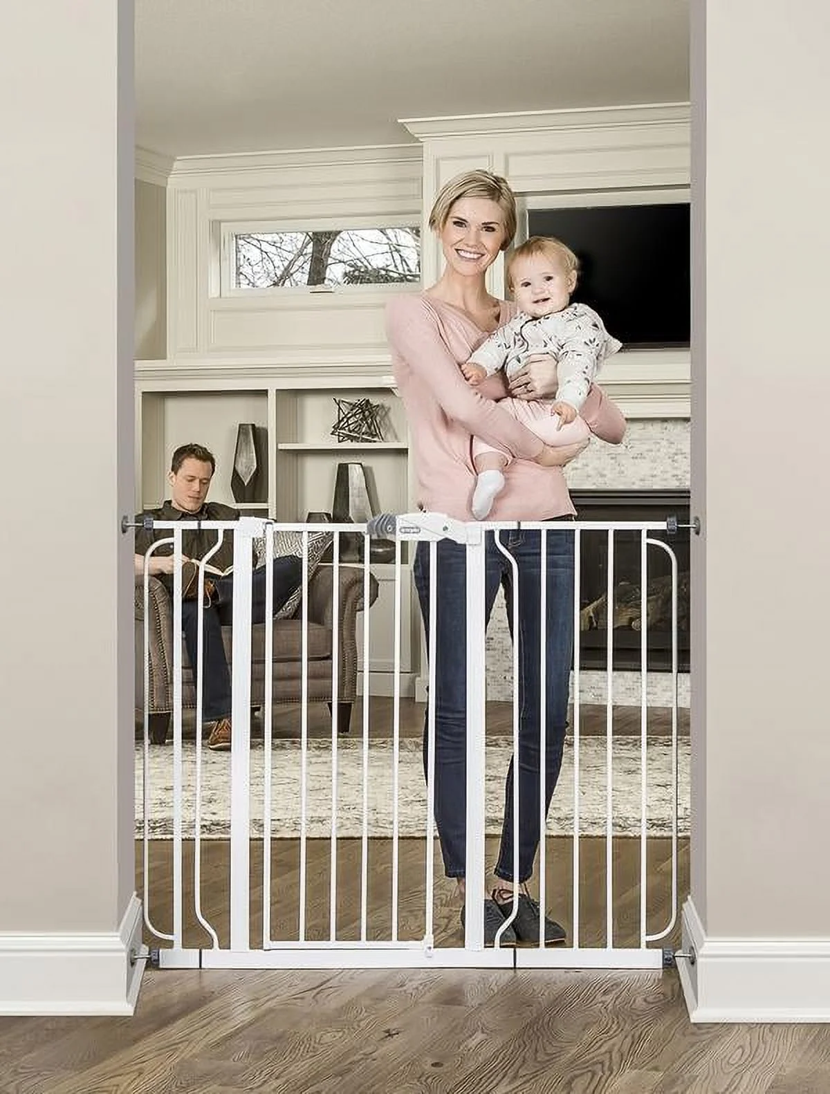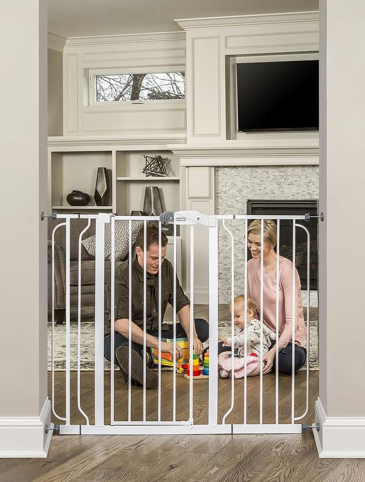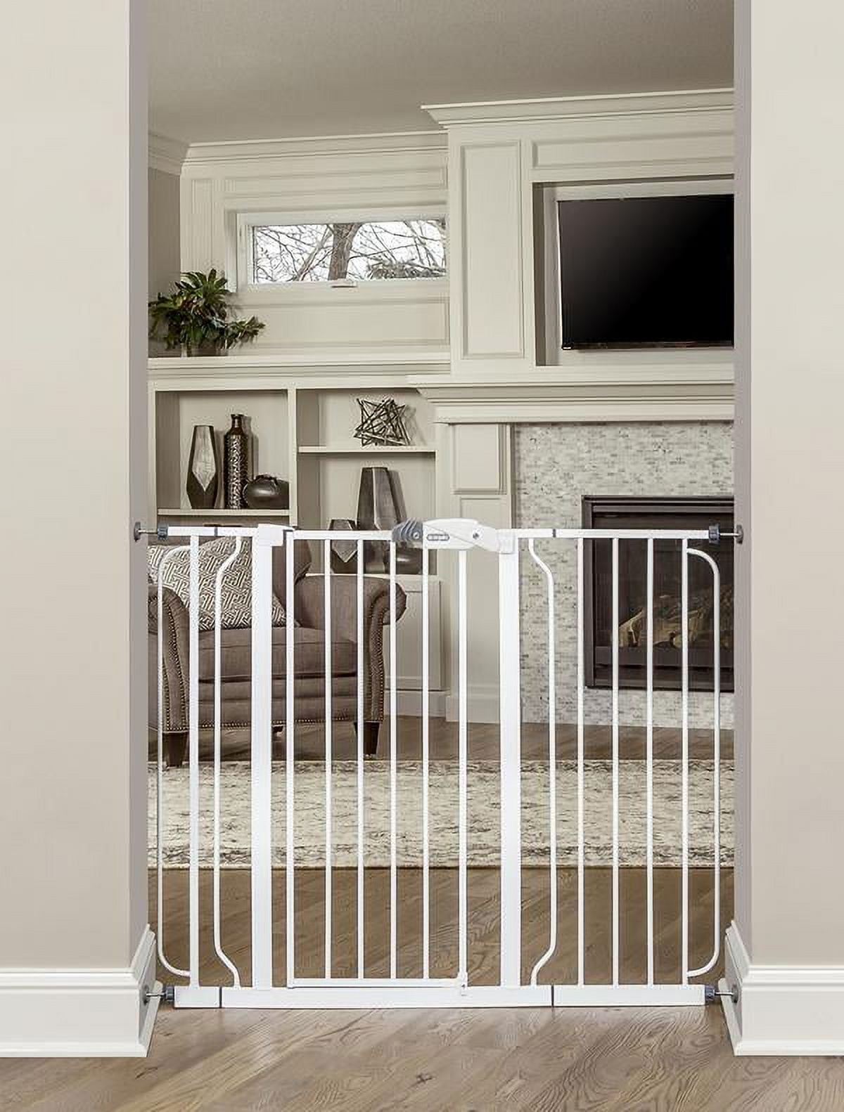 EXTRA WIDE AND TALL: Expands to fit openings between 29-38 and 42-49 inches wide. Stands 36 inches tall. Please be sure measure your opening prior to purchase to ensure proper fit SET UP: Install according to manufacturer’s instructions. You must use wall cups to keep gate in place. To prevent falls, never use at top of stairs. ADJUSTABLE: Includes a 4-inch wide and 12-inch wide extension kit and 4 pressure mount spindle rods. Perfect for doorway, hallway and bottom of stair use. Gate can quickly be removed out of the opening for easy storage. Additional extensions sold separately. DURABLE AND CONVENIENT: The all steel design is durable and convenient with a walk-through door. Certified to both JPMA and ASTM standards. SAFETY: Includes multiple safety-lock features, four wall cups for added security and mounting hardware. Perfect for children 6-24 months. Great for PETS TOO.