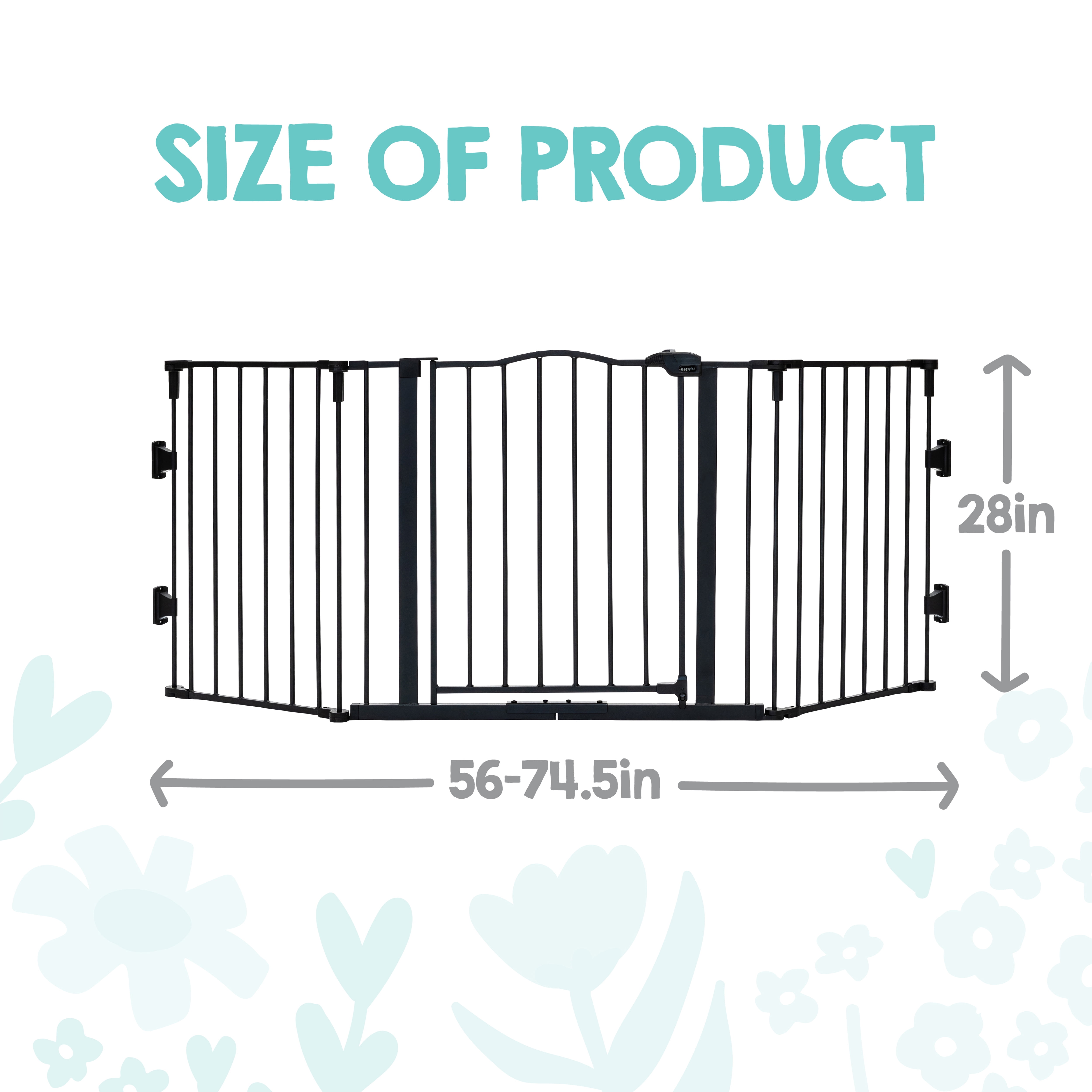 SUPERWIDE: Fits opens up to 74.5 inches wide and stands 29 inches tall. Can convert into a play yard with added extensions sold separately. HOME DECOR: Arched gate with premium black finish. The minimum opening allowed is 56 inches.Wipes clean CONFIGURABLE: Can be adjusted to meet any opening, hallway, doorway or bottom of stairs. Folds flat for storage. Convenient walk through design (19.5 inch opening) SAFETY: Designed with safety-lock, meets all safety standard. Hardware mount for added security. Perfect for children 6-24 months. Great for pets too. DURABLE AND CONVENIENT: The all steel design is durable and convenient with a walk-through door