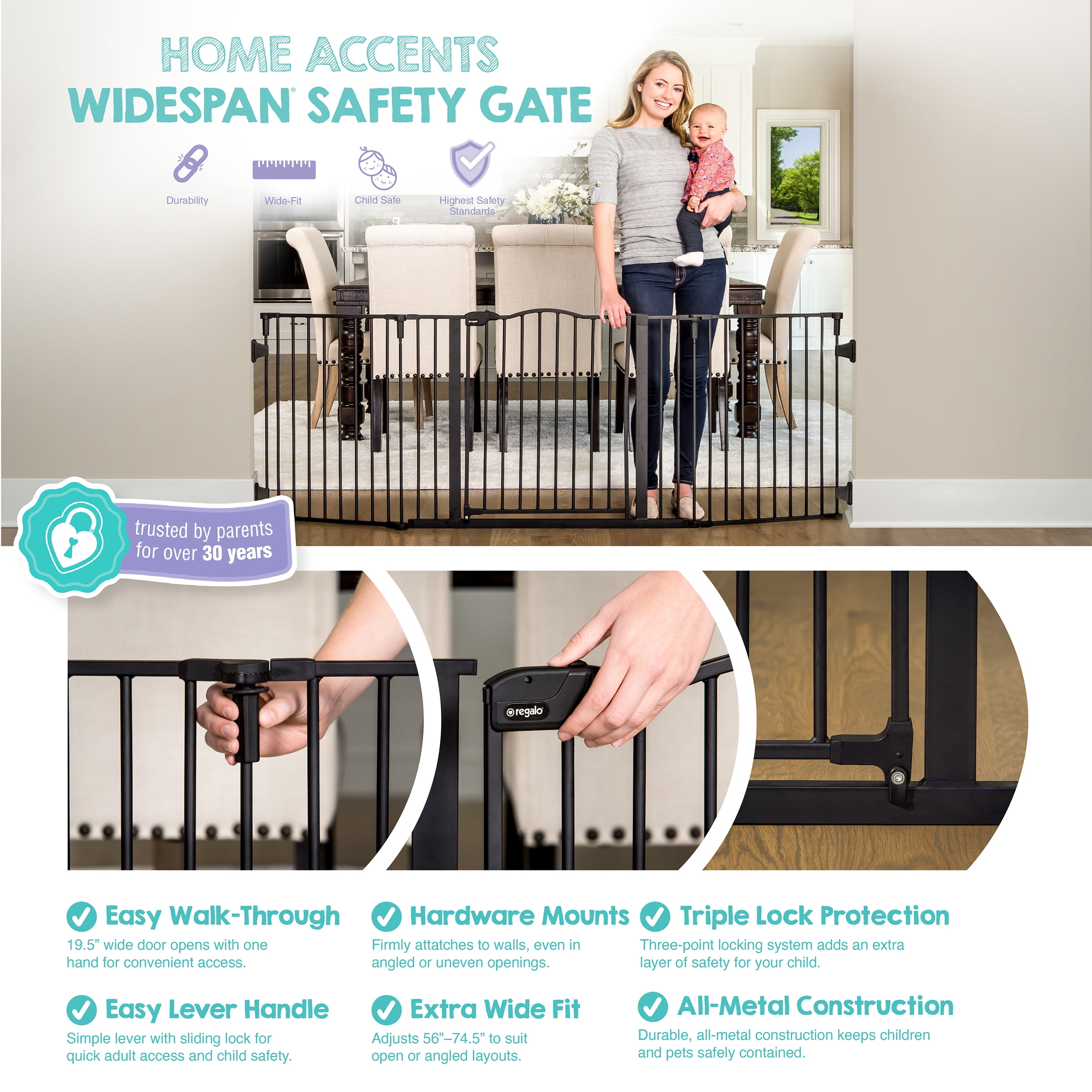 The versatile Regalo Home Décor Super Wide Baby Gate is an essential tool for homes with an open floor plan or unusually shaped or angled openings. The safe and convenient gate stretches to fit a variety of openings and is a unique way to protect both your child and home. Made of an all-steel construction, the black décor gate can be arranged a variety of ways. Spanning to fit odd shaped openings from 56” up to 74” wide. Easily mounting to the wall, the convenient gate features a large walk-through door designed with a three-lock system for added security.