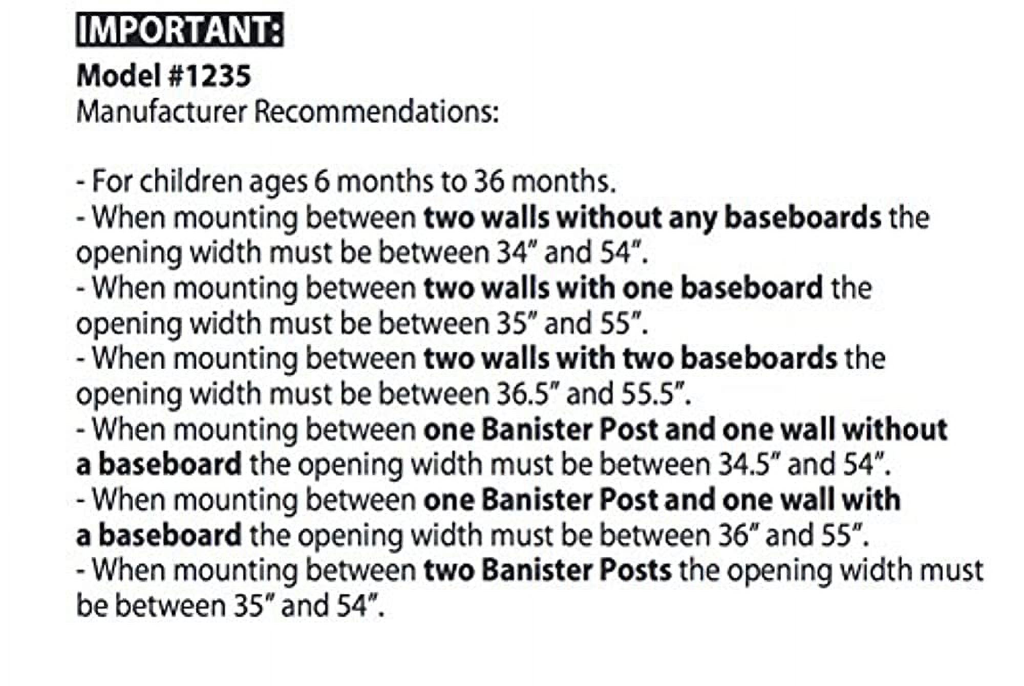 EXTRA TALL AND WIDE: Expands to stairways and openings between 34-55 inches wide. Stands 35 inches tall. Please measure your stairway opening prior to purchase to ensure a proper fit. VALUE BUNDLE: Includes gate, mounted level poles, banister corner protectors (16), square banister adapters (4), plastic wall spacers (6), round banister adapters (1), and wall mounting hardware ADJUSTABLE: Perfect for doorway, hallway and top or bottom of stair use. Gate can quickly be removed out of the opening for easy storage. Sturdy, all metal frame. Wipes clean DURABLE AND CONVENIENT: The all steel design is durable and convenient with a walk-through door SAFETY: Includes safety-lock feature. Perfect for children 6-36 months. Great for PETS TOO! Note : Refer to the PDF attached below in Technical Specification for Manuals