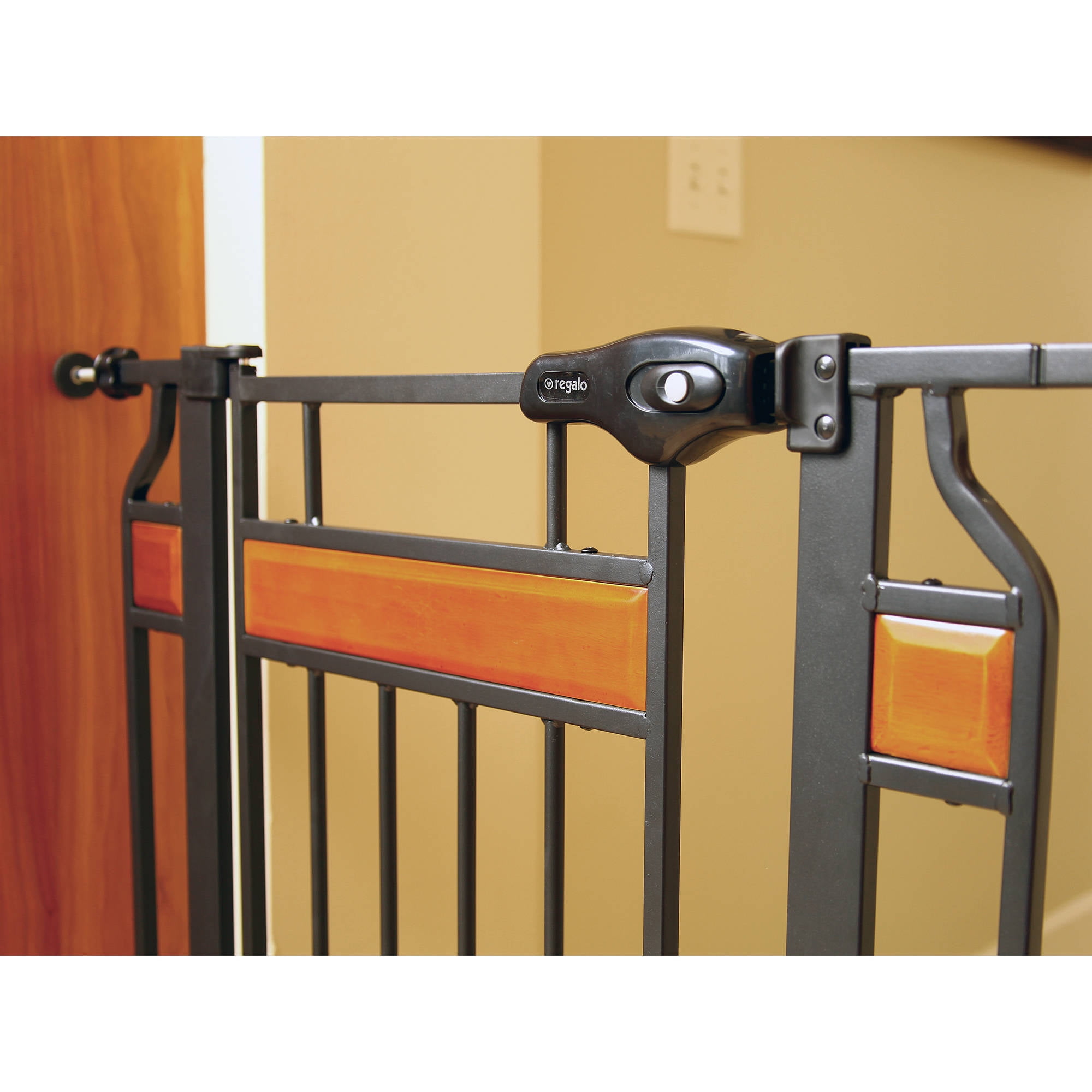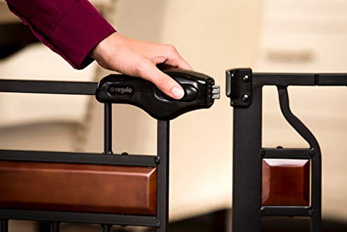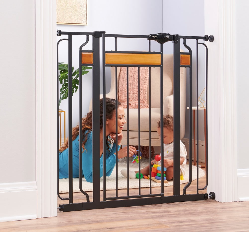 The day has come. Your baby is now mobile. Especially if you have a little climber, a baby gate is a must. This Regalo 0320DS Home Accents Extra Tall Adjustable 42-Inch Metal Walk-Through Baby Safety Gate helps you section off your home. If you’re looking for a gate with a little style, the Regalo Home Accents Extra Tall Designer Baby Gate has enhanced styling’s while keeping the functionality you need from a baby gate. Boasting a black steel frame, with cherry wood accents, the extra tall designer gate stands 37 inches high for extra protection and was made with durability and strength in mind. The gate is attractive, simple to use and adjustable to accommodate door openings between 30 and 42 inches. To make gate installation a breeze, pressure mount the gate with the included rubberized tension knobs or use the included hardware to attach the gate to your wall.