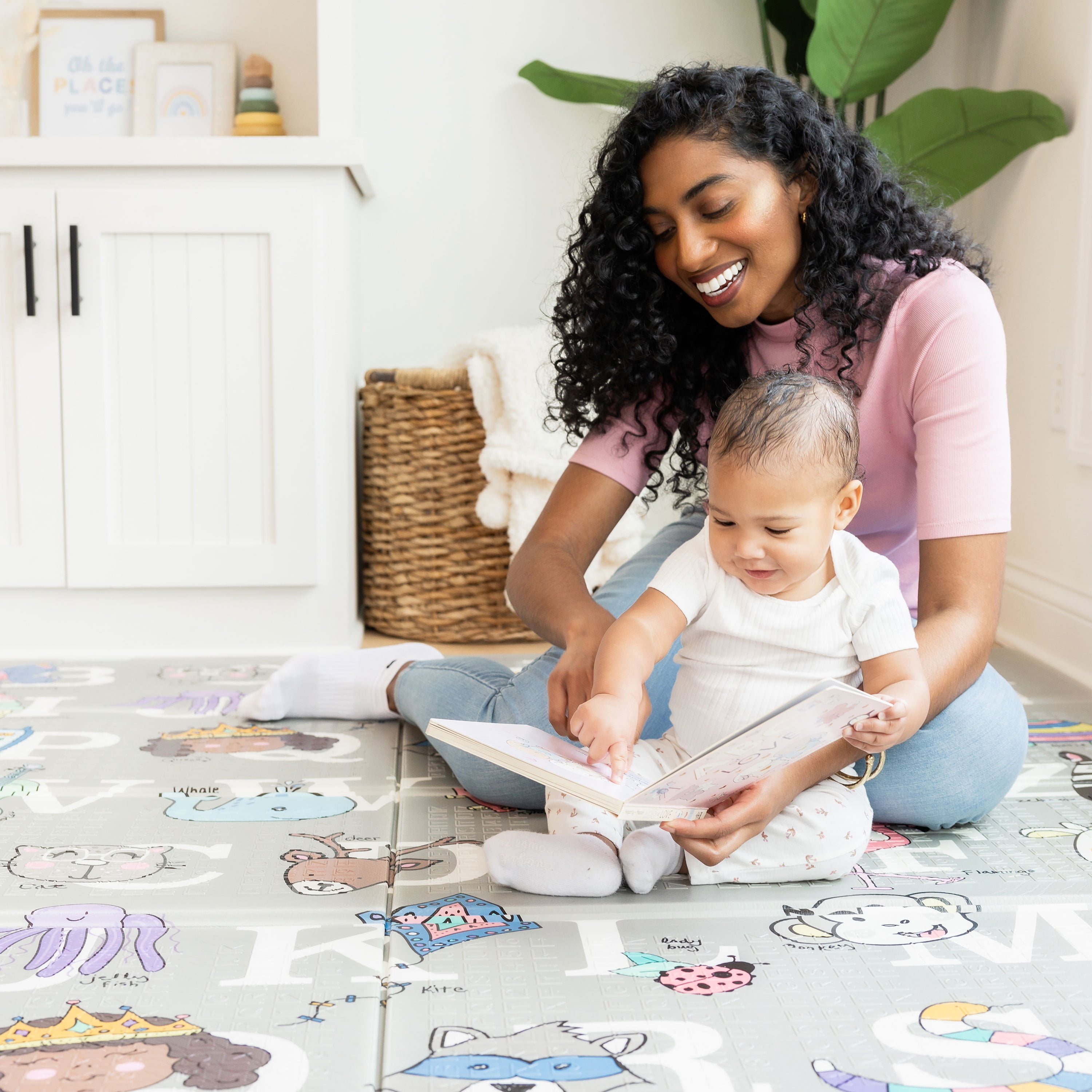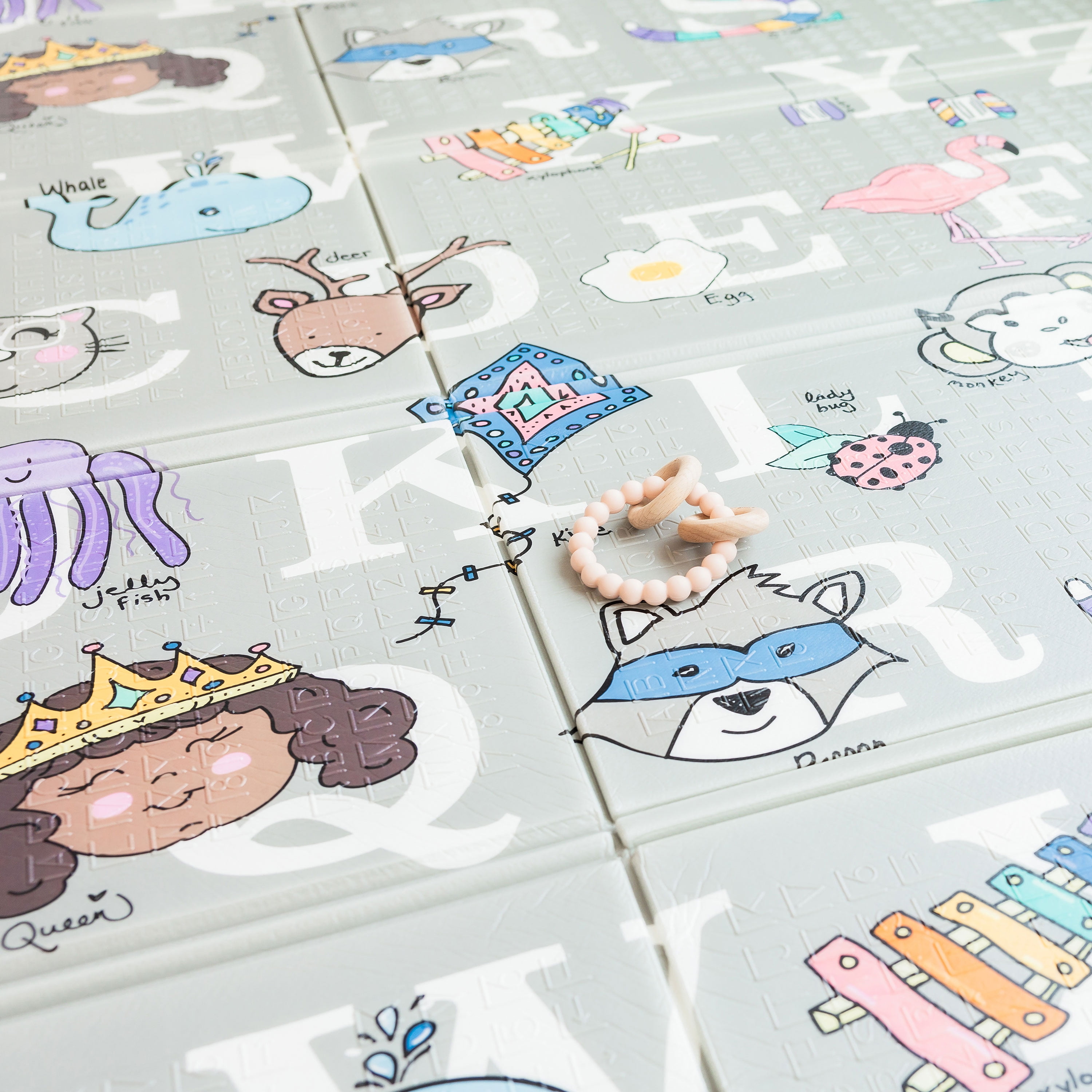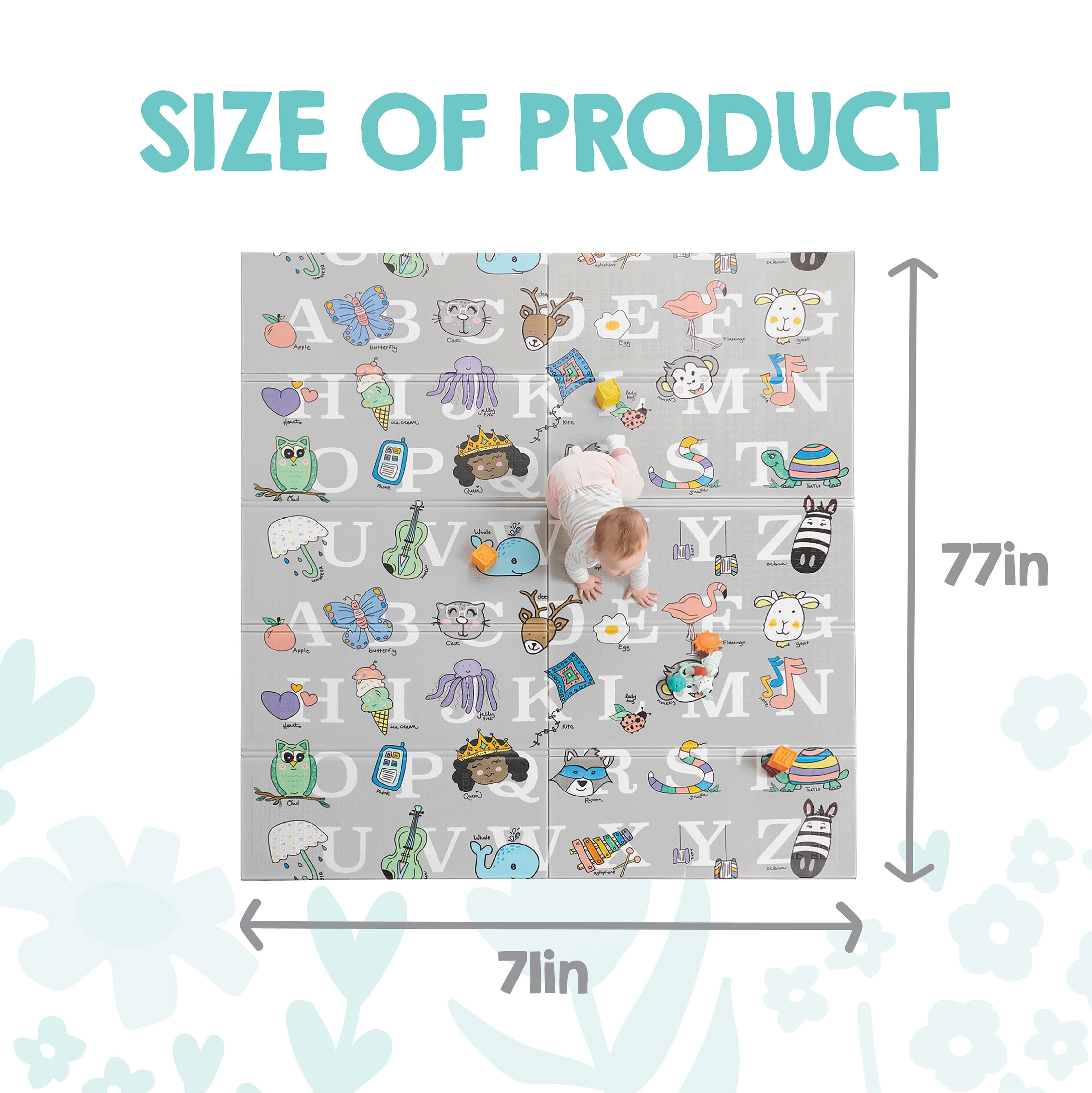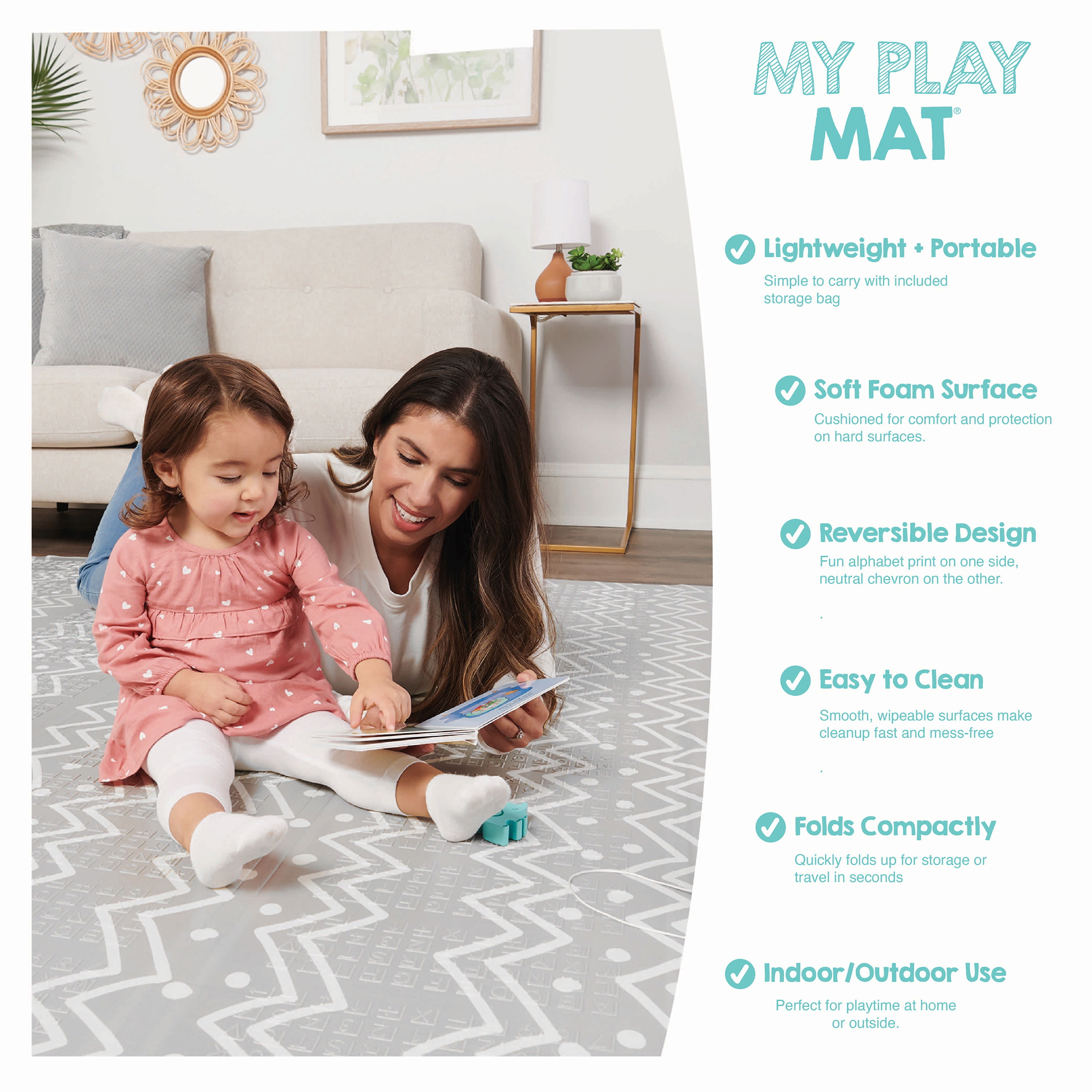 The Regalo My Play Mat™ is a lightweight, foldable, play mat ideal for home, time spent outdoors, and when traveling. Ideal in protecting those little hands and feet by covering hard surfaces or to create a play space – the My Play Mat™ folds up in seconds to be tucked away for later use. This playmat is reversible featuring adorable alphabet characters on one side and gray chevron pattern on the opposite side. Measuring 77” x 71”, the My Play Mat™ is made with soft foam and is wipeable with a wet cloth for easy wipe down.