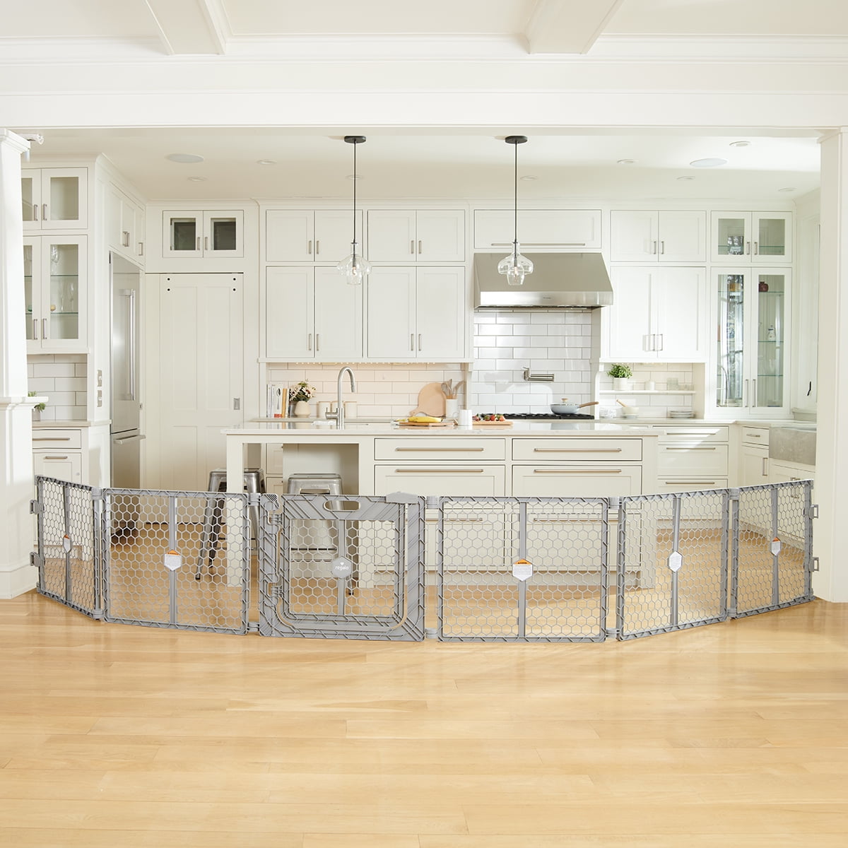 Providing a versatile way to keep your child safe, the Regalo 2-in-1 Play Yard and Safety Gate with Door offers you numerous gate or play yard configurations to protect your child. Made of high-quality plastic, the 6-panel gate expands up to 192” wide and is designed with plastic hinged posts to offer a variety of shaping possibilities. It is ideal for large and angled openings or as a play yard for your child. The 6-Panel Plastic Baby Gate is equipped with an attachable wall-mounting system allowing you to create a super wide baby gate. When not being used as a gate, secure the panels into a play yard by attaching and securing the hinged posts.