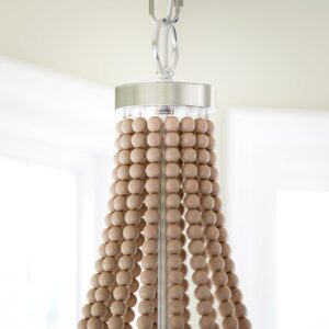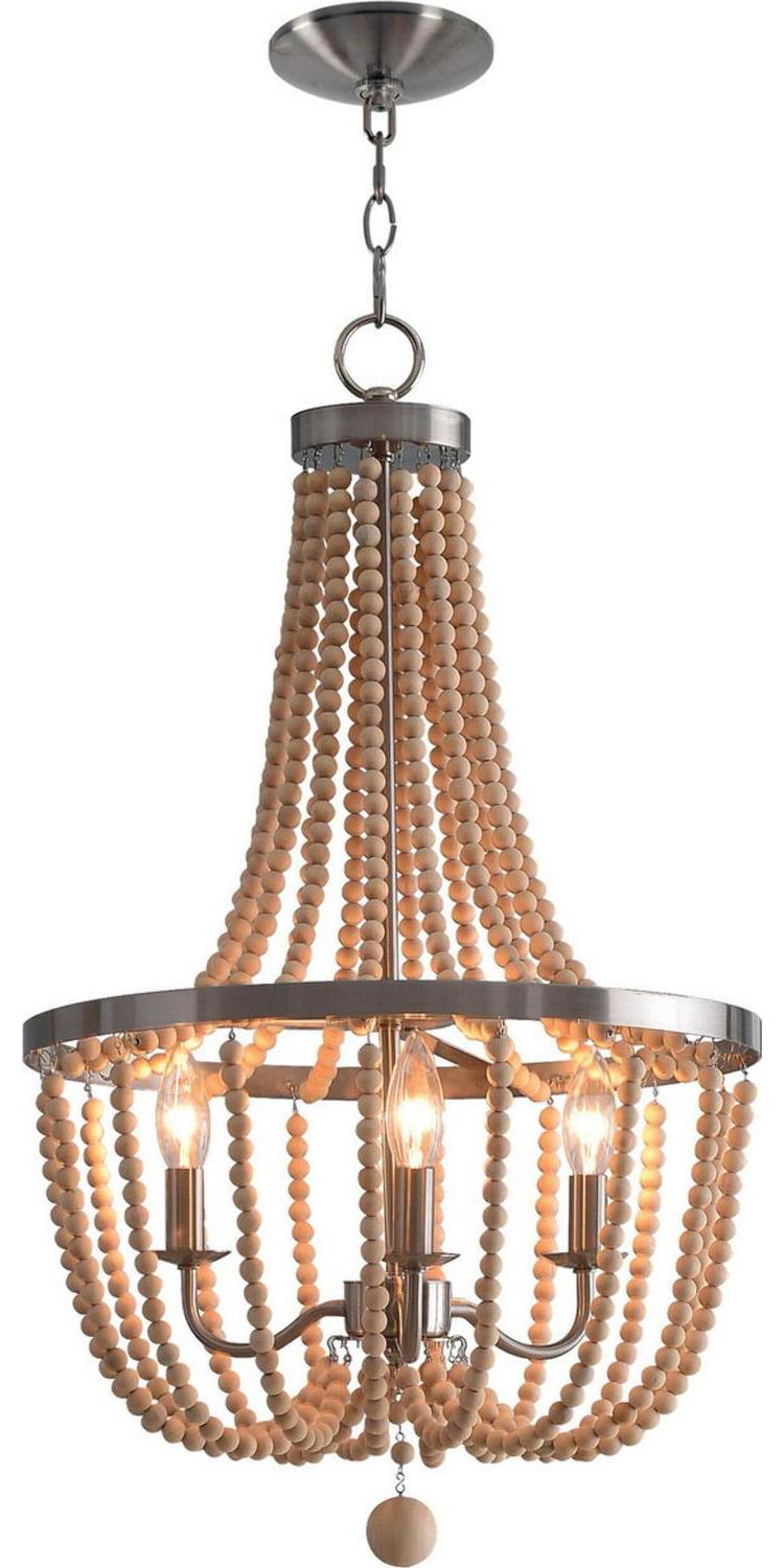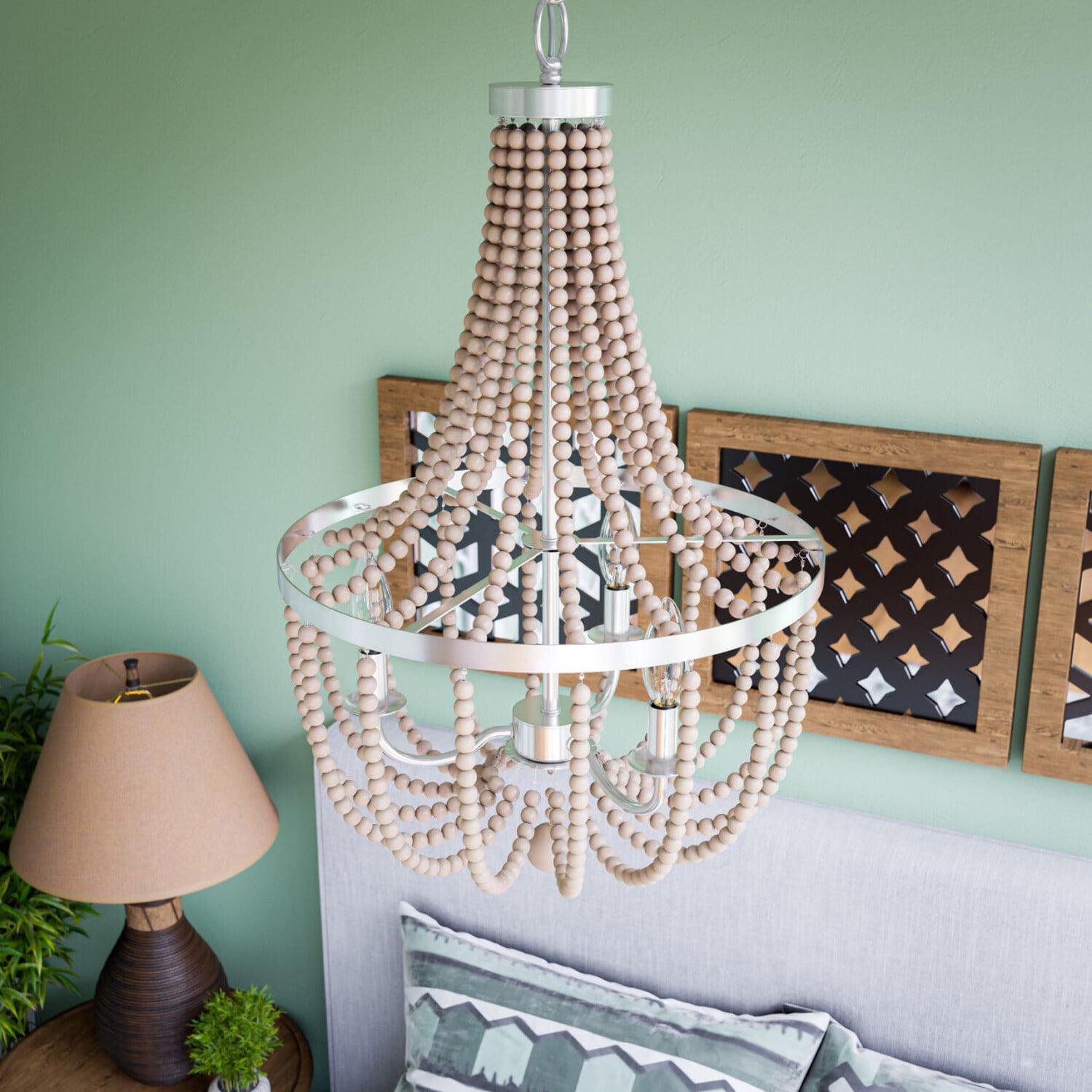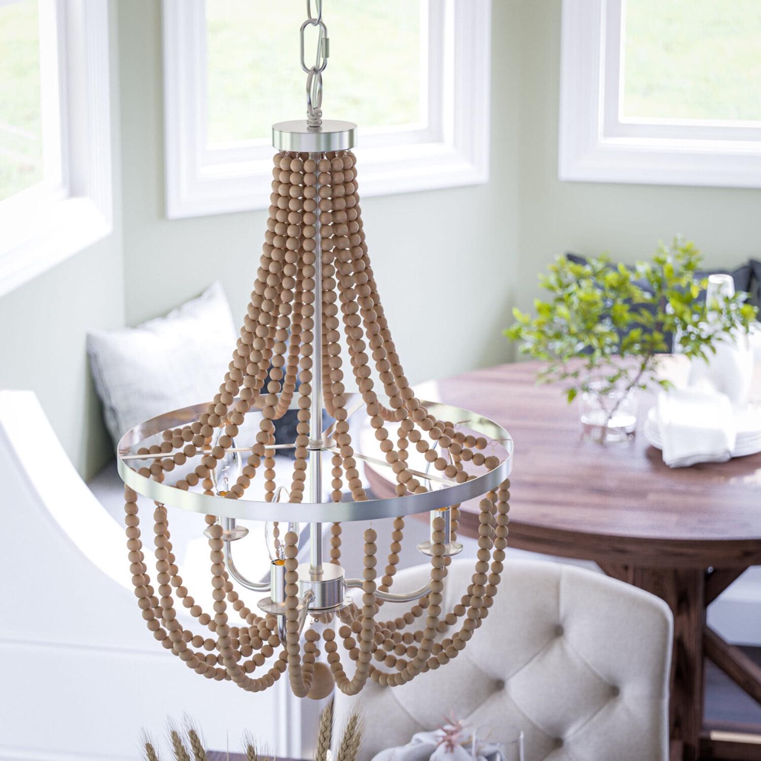 Dramatic, elegant chandeliers with a natural modern twist this beaded chandelier features a contemporary brushed steel finish paired with natural wood finished bead details for a bohemian look that really pops in nearly any environment. These beaded strands are elegantly draped over a round brushed steel frame, enclosing three candelabra bulbs and finished with a large wood bead drop in the center. Perfect for those looking for an eclectic centerpiece for their bohemian or modern farmhouse dining room, this 3 light chandelier includes mounting hardware, electrical wire and easy step-by-step instructions for a quick and easy installation. Suspend your new chandelier in your dining room, entryway, or bedroom over interesting placement options over a rustic bed, or in cozy living rooms with patchworked oriental rug just like you, this chandelier is unique. From the free flow of wooden beads to the soothing earthly tone of the brushed steel finish inner frame, this 3-light chandelier is full of life and will help shine a light on your chill and carefree design philosophy.