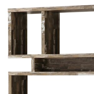 Modern decor is showcased on the shelves of this geometric bookcase Features three (3) tiers of shelving with two (2) storage compartments in between MDF, particle board, and laminate construction Also available in cappuccino, white, and weathered grey Wood finish: Salvaged cabin Assembly required: Yes