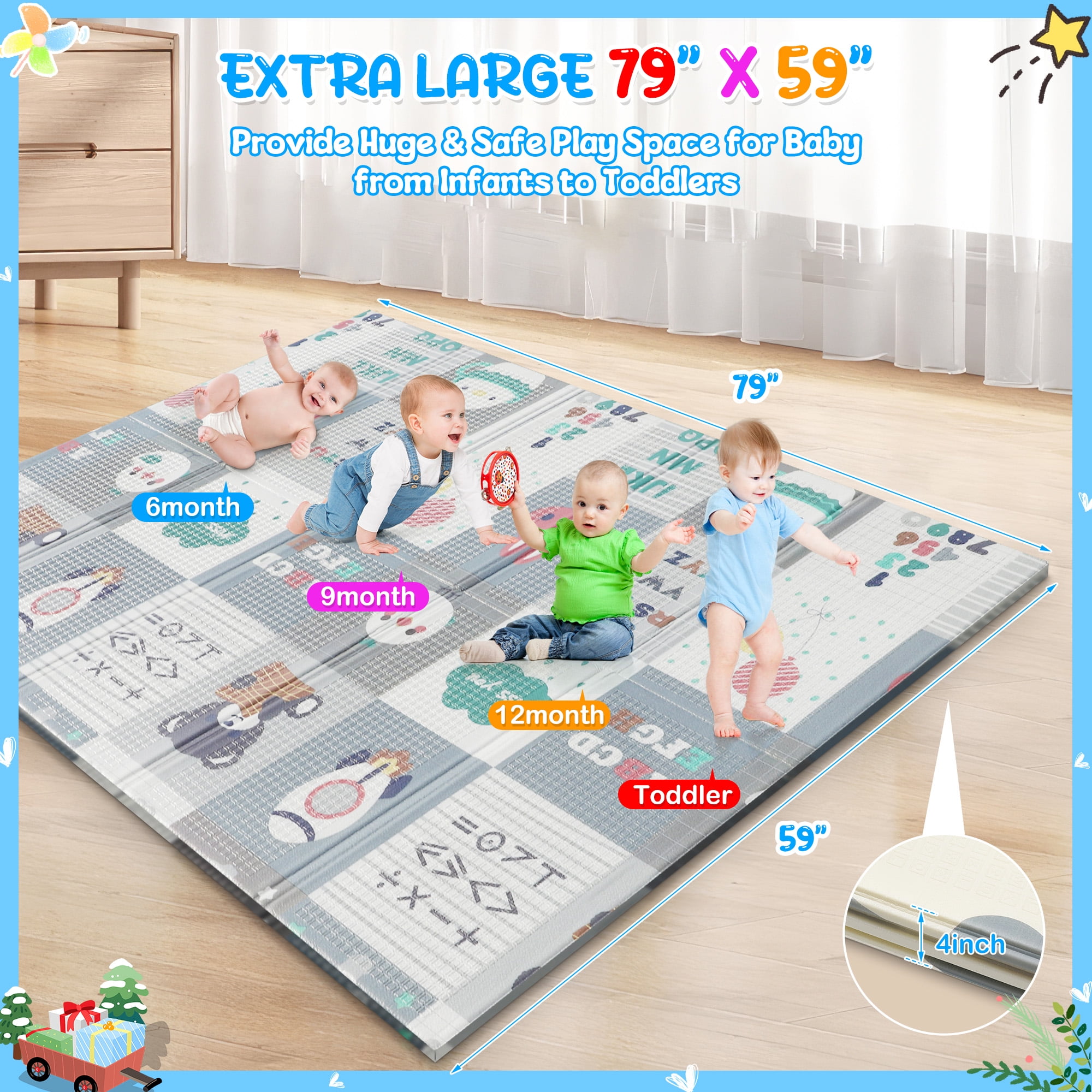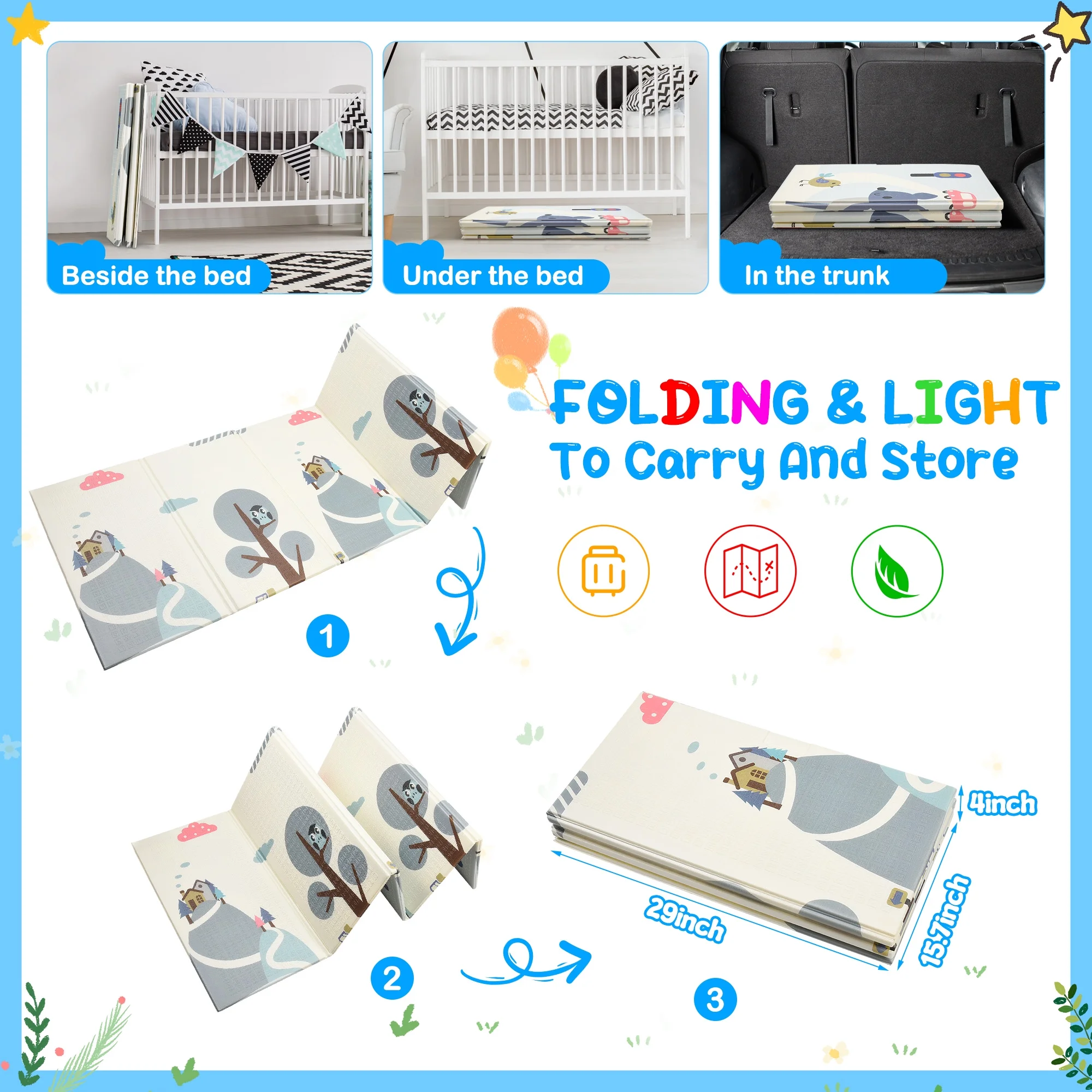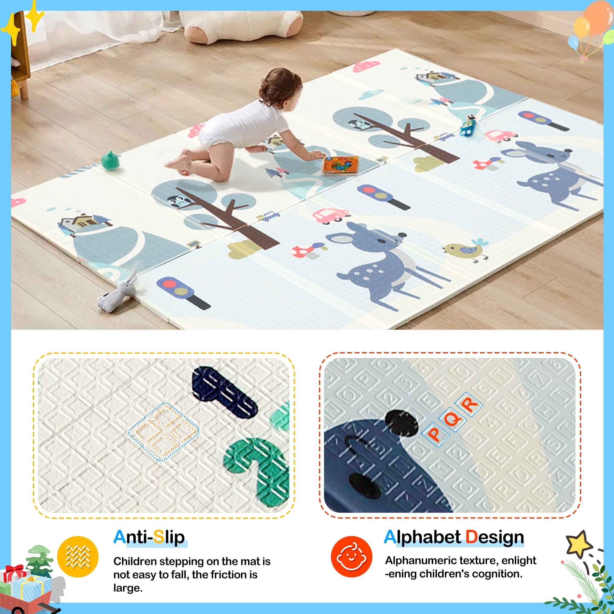 ▶ KEY FEATURES: ✨✨【Expansive and Secure Play Space】 Enjoy peace of mind with RELOIVE’s 79″x59″ extra-large foldable play mat, offering ample room for your child’s adventures. Perfectly designed for tummy time, crawling, and the first steps, its generous size ensures a safe and engaging area for play. Engineered to fit seamlessly inside playpens, this mat provides a thick, cushioned surface to protect your little one from falls, making every playtime a joy. 🎁🎁【Exceptionally Safe and Child-Friendly Material】 Crafted from high-density, anti-scratch XPE foam, RELOIVE’s foam floor playmat mat is the epitome of safety. This non-toxic, hypoallergenic, and BPA-free material guarantees a harmless environment for your baby’s sensitive skin, offering the safest protection for both mother and child. 🎃🎃【Effortless Maintenance and Durability】 Say goodbye to cleaning woes with our waterproof and easy-to-clean floor playmat. Resistant to rips and peels, it ensures messes from spills, food, or drool can be swiftly wiped away, leaving no stains or odors. The durable construction promises long-lasting use, making it a valuable addition to your baby essentials. 🍬🍬【Innovative Reversible Design for Double the Fun】 Double the educational value and enjoyment with RELOIVE’s reversible baby crawling mat. Each side features vibrant, engaging patterns including colorful animals, plants, letters, and numbers to foster cognitive development. The textured design enhances sensory experiences, promoting your toddler’s growth and exploration. 🎉🎉【Portable and Versatile for All Occasions】 Designed for convenience, this foldable mat transforms into a compact size (29.1” x 15.7” x 4.1”), complete with a stylish carry bag for effortless storage and transport. Whether it’s for home use, a day at the beach, park outings, or family visits, Baby Playmat provides a secure and fun play area anywhere you go. ▶ 🎀🎀SPECIFICATIONS: Brand: RELOIVE Material: XPE Foam; Expansion size: 79 x 59 x 0.4 in; Folding size: 29.1 x 15.7 “x 4.1in; ▶🎀🎀 Package Include: 1x handbag 1x Baby play mat
