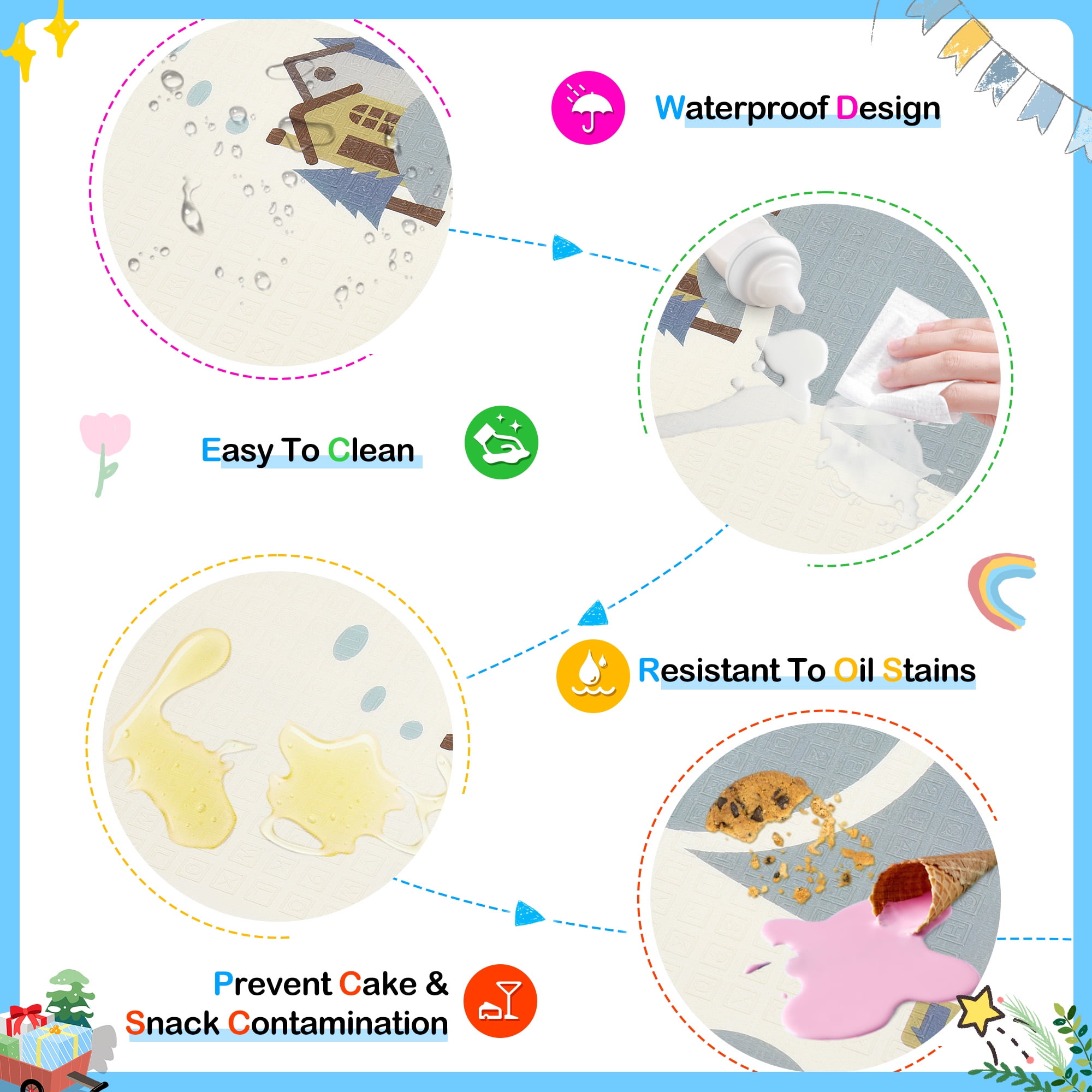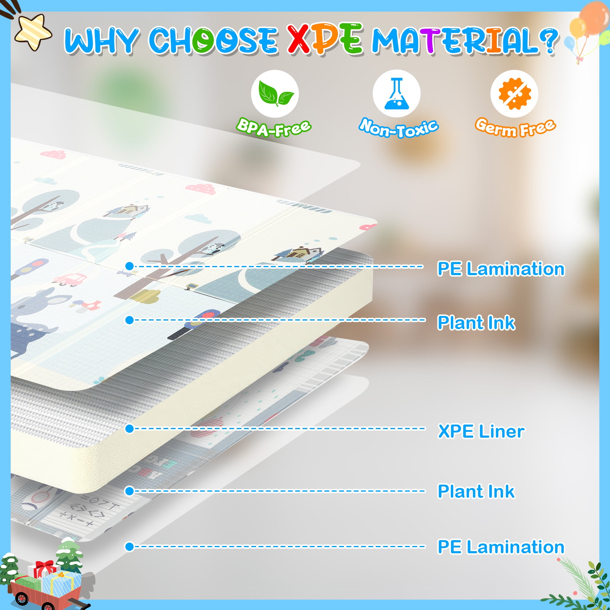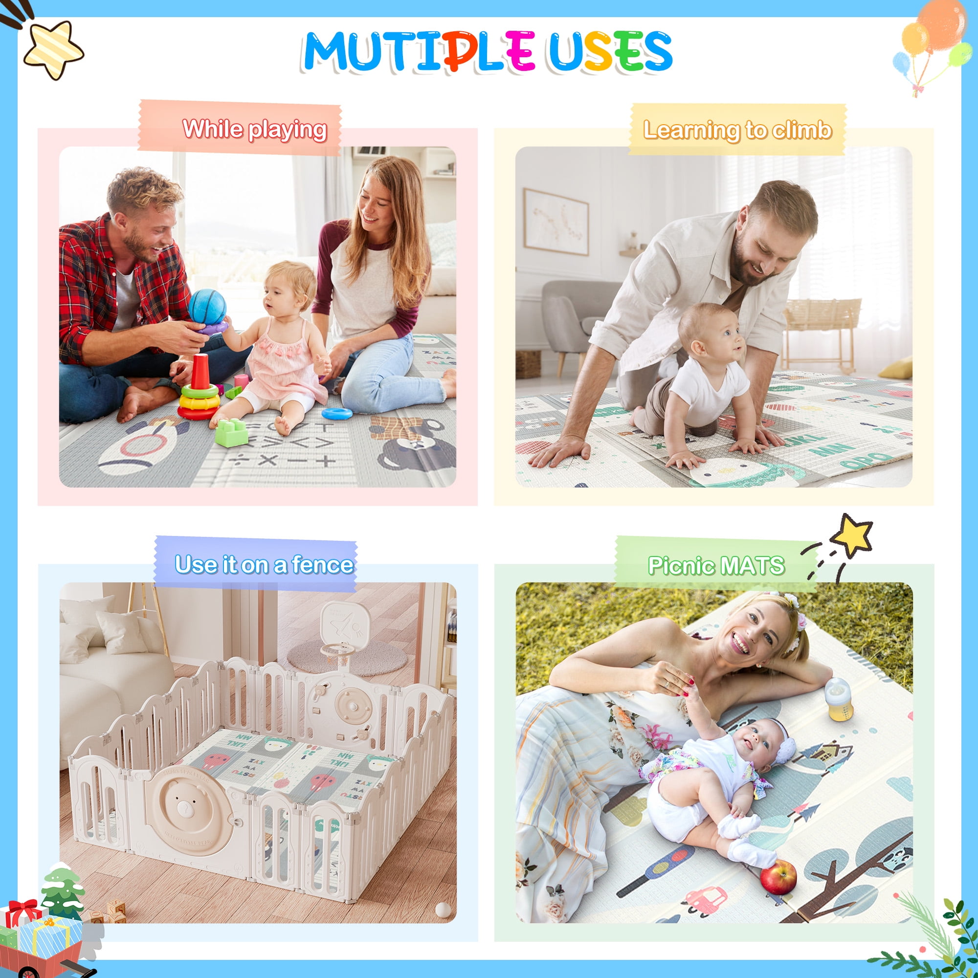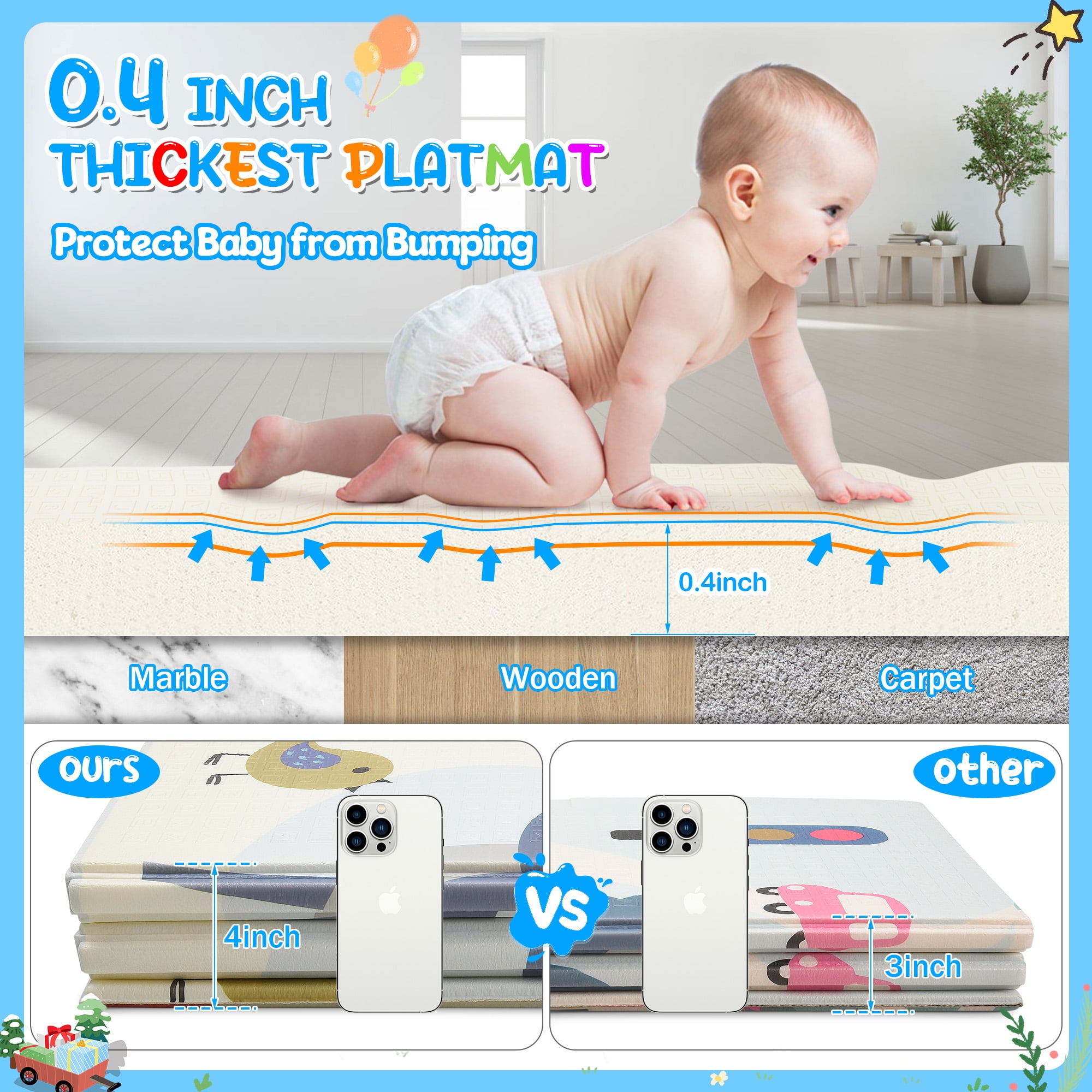 ▶ KEY FEATURES: ✨✨【Expansive and Secure Play Space】 Enjoy peace of mind with RELOIVE’s 79″x59″ extra-large foldable play mat, offering ample room for your child’s adventures. Perfectly designed for tummy time, crawling, and the first steps, its generous size ensures a safe and engaging area for play. Engineered to fit seamlessly inside playpens, this mat provides a thick, cushioned surface to protect your little one from falls, making every playtime a joy. 🎁🎁【Exceptionally Safe and Child-Friendly Material】 Crafted from high-density, anti-scratch XPE foam, RELOIVE’s foam floor playmat mat is the epitome of safety. This non-toxic, hypoallergenic, and BPA-free material guarantees a harmless environment for your baby’s sensitive skin, offering the safest protection for both mother and child. 🎃🎃【Effortless Maintenance and Durability】 Say goodbye to cleaning woes with our waterproof and easy-to-clean floor playmat. Resistant to rips and peels, it ensures messes from spills, food, or drool can be swiftly wiped away, leaving no stains or odors. The durable construction promises long-lasting use, making it a valuable addition to your baby essentials. 🍬🍬【Innovative Reversible Design for Double the Fun】 Double the educational value and enjoyment with RELOIVE’s reversible baby crawling mat. Each side features vibrant, engaging patterns including colorful animals, plants, letters, and numbers to foster cognitive development. The textured design enhances sensory experiences, promoting your toddler’s growth and exploration. 🎉🎉【Portable and Versatile for All Occasions】 Designed for convenience, this foldable mat transforms into a compact size (29.1” x 15.7” x 4.1”), complete with a stylish carry bag for effortless storage and transport. Whether it’s for home use, a day at the beach, park outings, or family visits, Baby Playmat provides a secure and fun play area anywhere you go. ▶ 🎀🎀SPECIFICATIONS: Brand: RELOIVE Material: XPE Foam; Expansion size: 79 x 59 x 0.4 in; Folding size: 29.1 x 15.7 “x 4.1in; ▶🎀🎀 Package Include: 1x handbag 1x Baby play mat