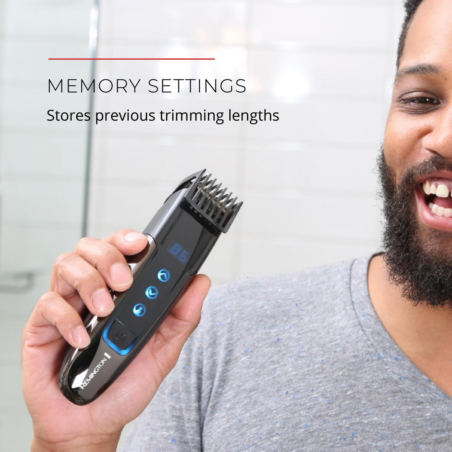 Find the ultimate precision and personalization for your facial hair. The REMINGTON Smart Beard Trimmer delivers up to 175 length settings using a motorized comb that moves in 0.1mm increments (0.4-18mm). Just pick up the trimmer to turn it on and restore the previous length setting you used. The memory feature is the perfect way to achieve your signature look time and time again. With Auto Turbo, the trimmer senses the level and thickness of your facial hair, and adjusts the trimming speed accordingly. This delivers a customized trimming experience that s comfortable and precise. The digital touch screen gives you intuitive control over length settings. The rechargeable lithium battery offers up to 50 minutes of cordless runtime or unlimited corded power. Plus, the trimmer is fully washable to keep your styling fresh every time.