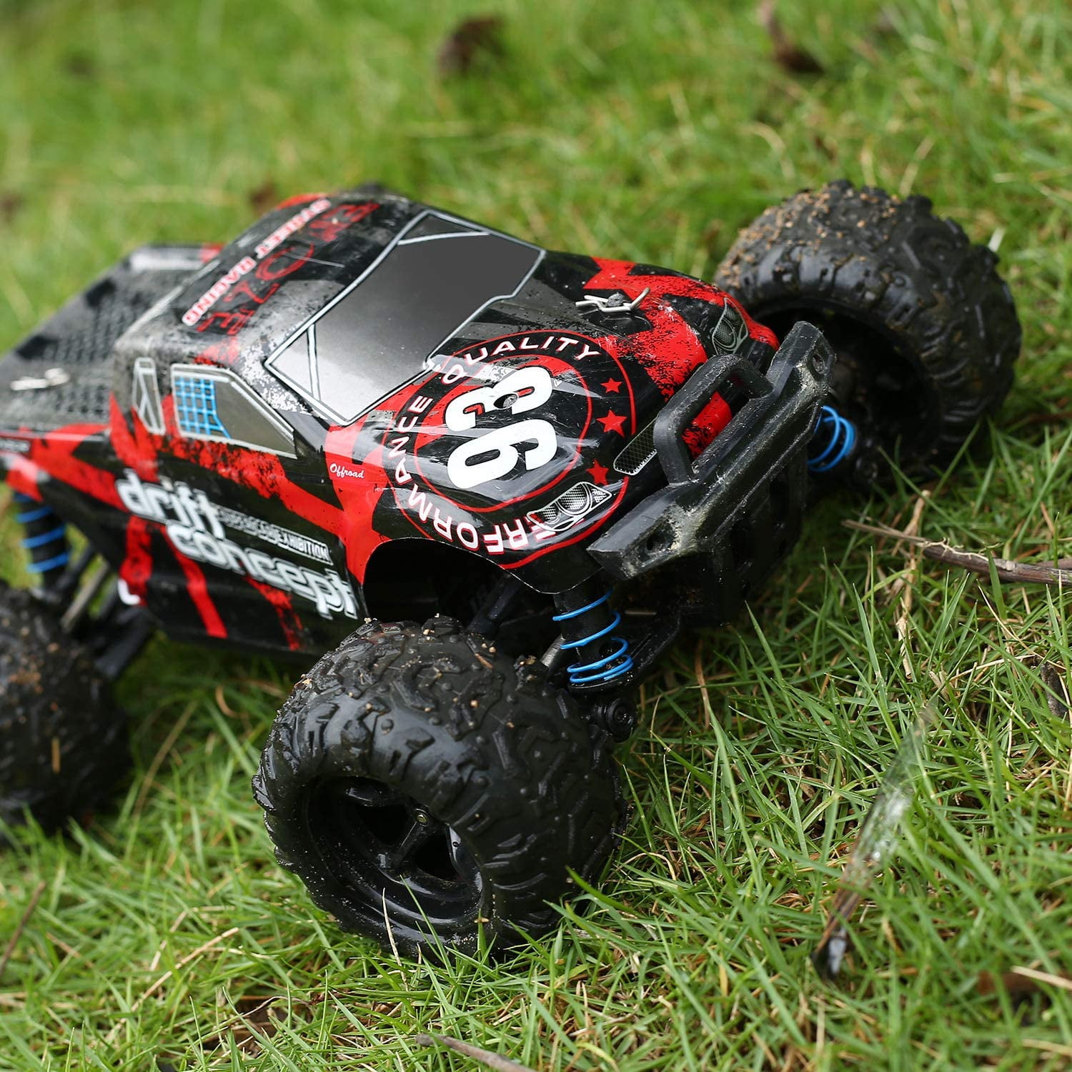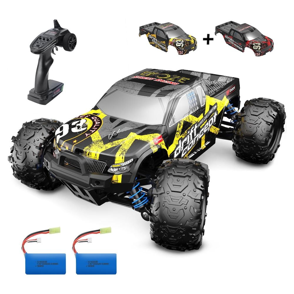 【40+ MPH Super Fast & 4×4】With powerful motor which runs at a high speed of 90-95m/s, You can reach maximum speed up to about 60KM/H 40+ MPH. Featured with 4 wheel drive and supported by 4 independent suspensions, the RTR remote control truck can gain strong power and a marvelous protection from collisions and a great increase on minimum safe dropping altitude. Give you endless exciting entertainment from off-road and on-road environments. 【2440 Waterproof Brushless Motor & 25A Brushless ESC】 Equipped with a strong brushless electric motor, the speed and lifetime of this sandy truck will be greatly increased. The life of the brushless motor is 2-3 times that of the brushed motor, and the power consumption is only 1/3 of the brushed. With the waterproof brushless ESC, you have 8 acceleration, 8 timing options and multiple protection. DEERC 300E High speed monster truck is ready to rip, just don’t blackout from excitement. 【2 High Capacity 1200mAH Batteries & One Extra Shell】The Radio Control Cars are equipped with 2*7.4V 1200 mAh rechargeable Li-Po batteries. The RC car for boys and adults will run for up to 20 minutes for each battery. 2 batteries for 40 minutes running! The extra red cover makes it easier to choose the color you like and adds another guarantee to your car. Expand your enjoyment and manufactured for high RC Racing performance. 【2.4Ghz Accurate System】Pistol Grip transmitter has full digital controls with proportional throttle and steering for smooth racing and turning with integrated 2.4GHz technology allowing up to 12 vehicles to run at the same time. Adjust the speed switch clockwise to increase driving speed, and adjust the speed switch counterclockwise to decrease the driving speed. Our hobby grade RC car can be easily controlled within a range up to 328 feet. Suitable for any level RC vehicle enthusiast. 【All Terrain & Off-Road RC Car】Constructed with all metal sealed ball bearing and the oil filled metal shocks(need to fill the oil by yourself), anti-skid rubber tires, anti-vibration shock absorber and nylon chassis, the cross-country car is ready to run, whether it is sand, mud, stone rugged mountain roads. Comes fully assembled, straight out of the box. Good for indoor and out door. Decent car toy gift for adults and children of different ages. Racing with your family or friends.