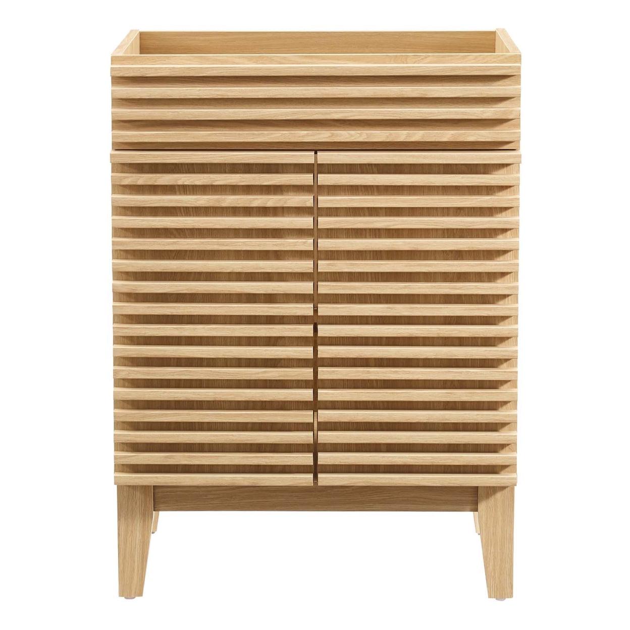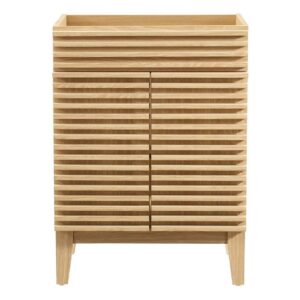 Render Bathroom Vanity Cabinet (Sink Basin Not Included)-EEI-4598-OAK Tap into mid-century aesthetics with the Render Vanity. Render Bathroom Vanity features a durable MDF and particleboard frame with smooth walnut grain laminate, four tapered wood legs, and adjustable storage shelf behind two soft-close hinged doors. Sleek lines and crisp design align for an edgy style designed to meet your needs. Boasting a mid-century modern style this vanity features a solid construction with a pleasing look and practical functionality. Assembly required and sink basin not included.Set Includes:One – Render Bathroom Vanity Cabinet (Sink Basin Not Included)