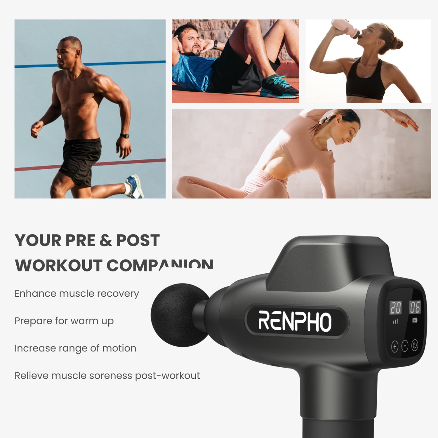 Massage Gun with 6 Replaceable Massage Heads Helps relax all parts of the body, such for back, neck, arms, legs, muscle massage ① Ball Head: for targeting large muscle groups and joint soreness ② Air Cushioning Soft Head: for sensitive muscles ③ Wedge Head: for alleviating muscle spasms ④ Bullet Head: for joints, deep tissues, and trigger points ⑤ Hammer Head: for intense massage of flat muscle groups ⑥ U-Shaped Head: for spine, neck, and shoulder Renpho handheld massager through deep and powerful high-frequency vibration stimulation for pain relief Massager gun for sports athletes, bodybuilders, fitness, and those with dense body mass muscle massager relieves fascia and stiff muscles, relaxes soft tissues, relieves fatigue, and restores well physical condition Hand massager Best gift choice for family or friends daily massage, relieve fatigue, relax muscles, repair injury Great Benefits of Using a Massage Gun ① Improve the pain symptoms of patients with fasciitis ② Promote muscle and soft tissue recovery ③ Relieve muscle soreness after exercise ④ To help metabolize lactic acid and reduce muscle tone ⑤ Increased temperature and blood flow of muscle groups ⑥ Relaxes tight muscles and breaks up knots ⑦ Helps you massage joint soreness, muscle tension, pains ⑧ Benefit Overall Health