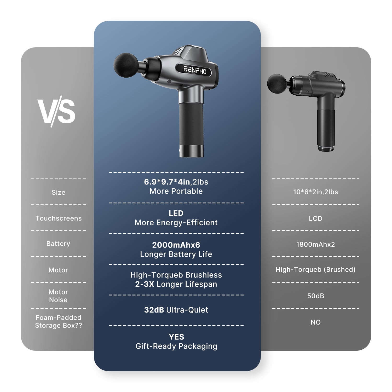 The RENPHO deep tissue massager it produces softens stiff muscles and soothes the tissue around them, renpho massage gun providing a relaxing effect to the treated area. It helps speed athletes’ recovery from stressful workouts and is ideal for those who need to relax their muscles and get rid of physical fatigue. By enhancing blood flow, it improves your range of motion and reduces tension, allowing you to feel better and relaxed in your everyday life. This handheld massager pushes muscles up to 16mm to soften stiff muscles, improve blood flow and range of motion, this protable handheld massager also helps to reduce fatigue and create a relaxing effect that leaves you feeling better and more relaxed. Built-in 2000mAh rechargeable long-lasting lithium battery, which can last about 4-10 hours on a single charge. Weighing only 2.14 lbs, it is easy to grip and operate, and feels comfortable in the hand. High-quality suitcase, super convenient to carry on the go. A gift box package is also a great option for your friends,lover and family. RENPHO C3 Powful Deep Tissue Massage Gun Specification Ergonomic silicone handle Lightweight & carrying case 6 Replaceable Massage head 20 Adjustable speed levels 24V High-torque brushless motor 10MM Amplitude 51 LB Stall force max 3200 RPM max 15 Mins Timer off 45 db ultra quiet LED display 80W maximum output power 2000-mah Battery Runnin Life>10000H Material:ABS+PC+Silicone Product Dimensions:6.89*9.65*3.99
