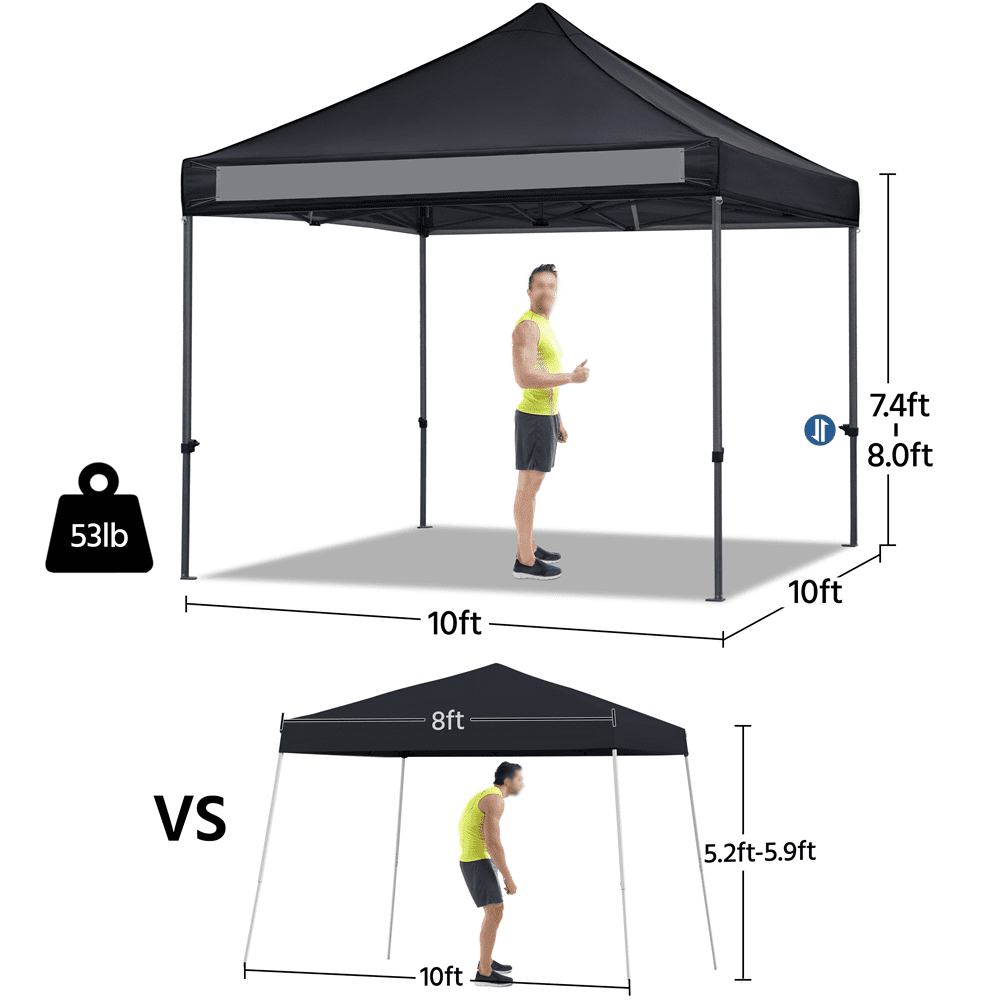 Renwick 10x10ft Outdoor Pop Up Canopy Tent with Wheeled Carry Bag, Black: Canopy Color: Black Material: 500D Polyester, Steel Assembled Dimensions: 10′ L × 10′ W × 10.6-11.2′ H Eave Height:6.5-7′ Storage Bag:10.2″ L × 10.2″ W × 64″ H Banner Section: 10′ W × 1′ H Item Weight: 50 lb Shipping Weight:55.2 lb