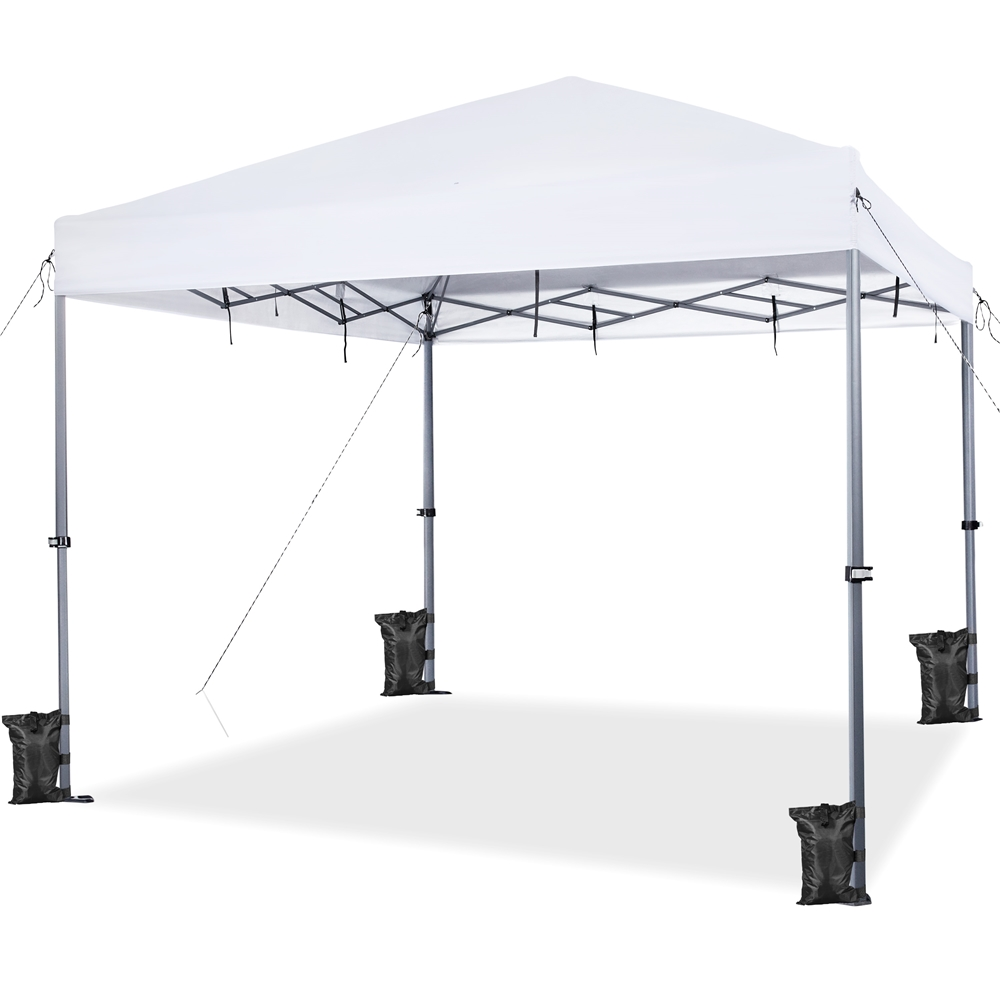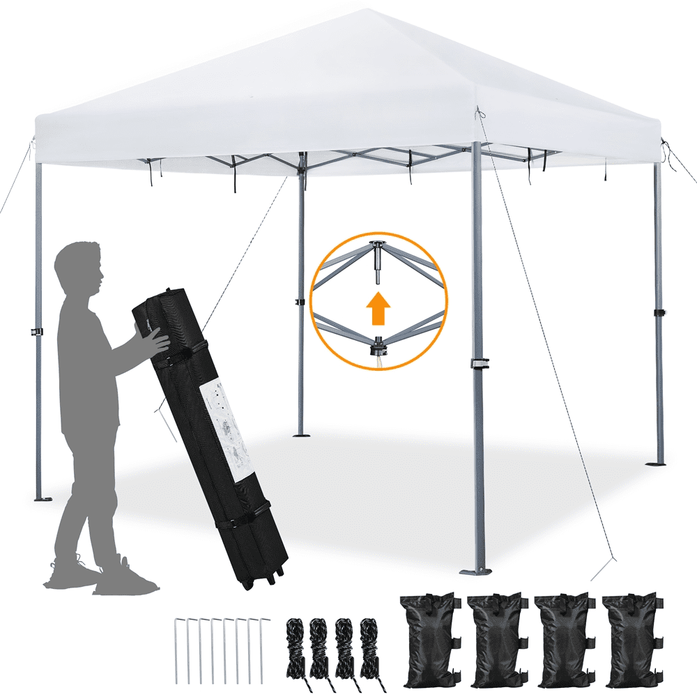 Renwick 12x12ft Outdoor Pop-up Canopy with One-Push-To-Lock Setup Mechanism, White: Canopy Color: White Materials: Powder-coated Steel, Polyester Fabric Assembled Dimensions: 12′ L × 12′ W × 7-9.5′ H Roller Bag: 9″ L × 9″ W × 57″ H / 0.7′ L × 0.7′ W × 4.8′ H Item Weight: 47.1 lb Shipping Weight: 50 lb