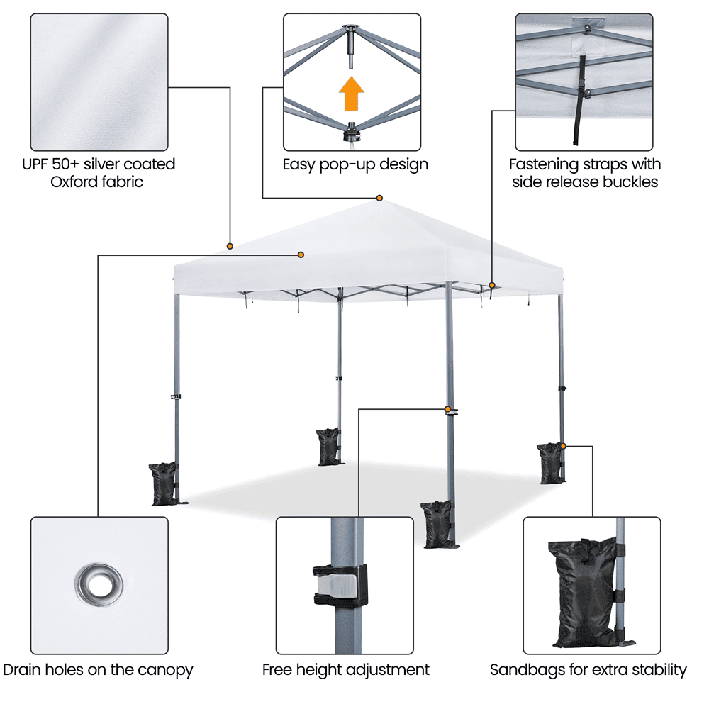 This Pop-up Canopy is constructed of UPF 50+ Oxford fabric with silver lining and powder-coated steel frame. The one-push-to-lock mechanism allows for a simple setup. The canopy can be fixed at any height from 7′ to 9.5′ freely. This versatile 12×12ft canopy creates a large, cozy, shady area for 12 to 18 people in your backyard/driveway, garage sales, or other commercial events. A roller bag, 4 guy lines, 8 metal ground anchors, and 4 sandbags are included for your convenience.