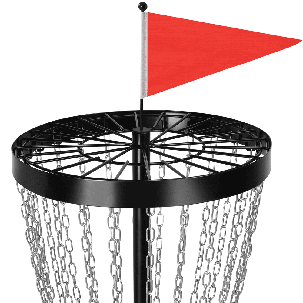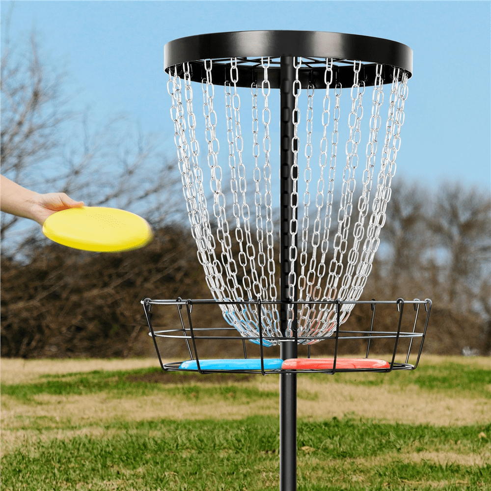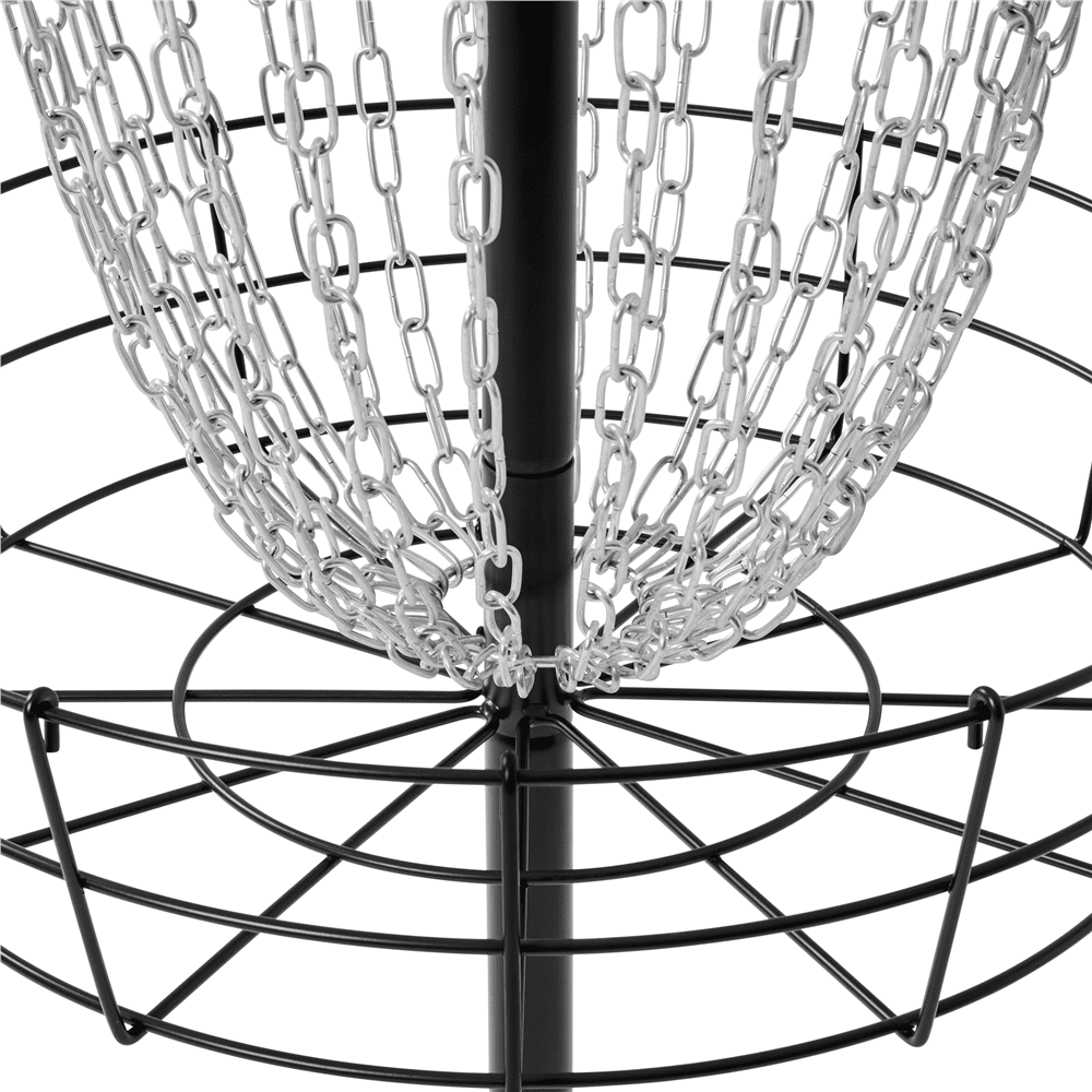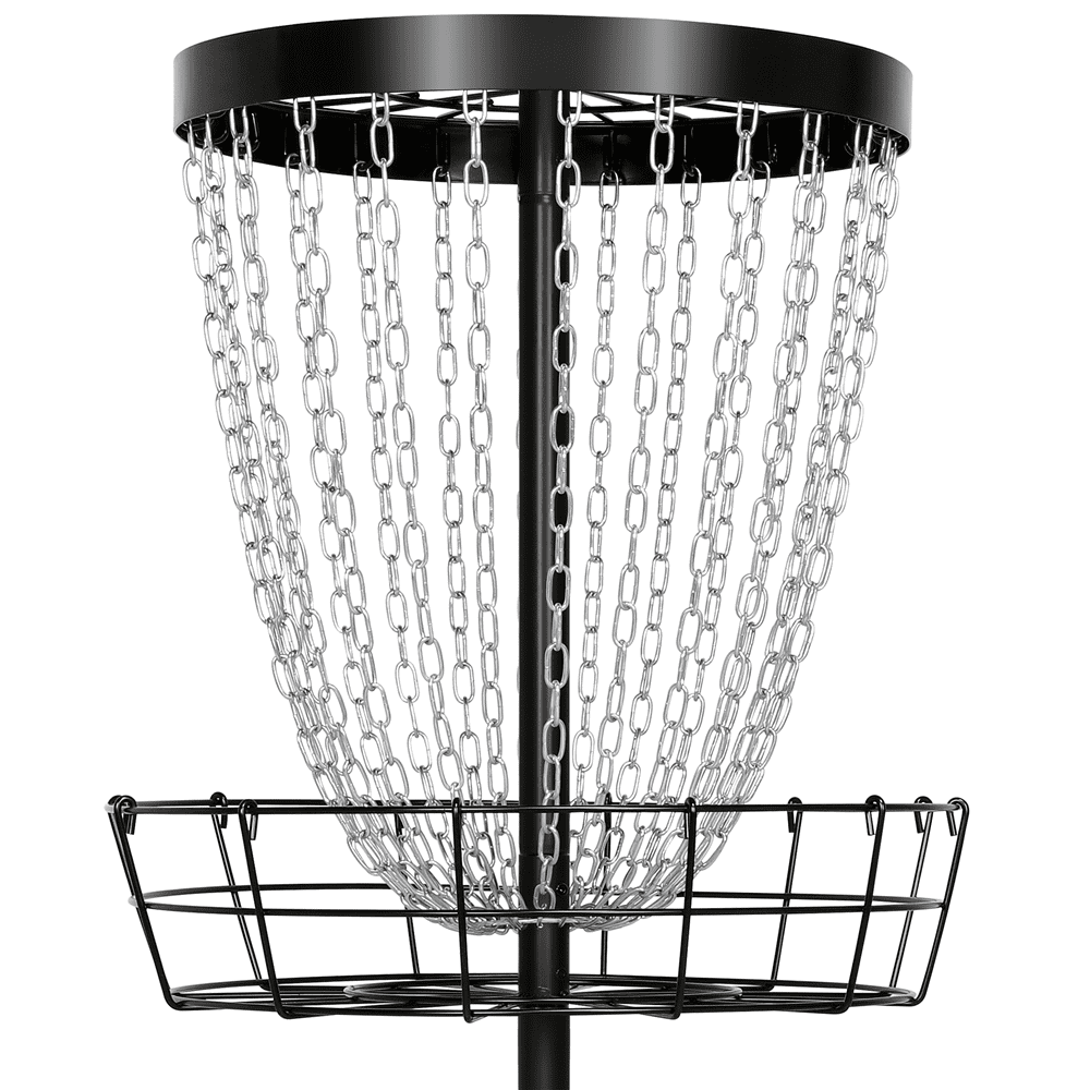 This portable, durable, easy-to-assemble disc golf target basket is ideal for practicing your flying disc in the backyard, schoolyard, or park. You can even load it up in the car trunk for family trips. Constructed of heavy-duty painted metal frame and galvanized chains, this 24-chain disc golf basket is built to withstand the elements and is ready for your long-term use. It is built to standard height, providing both starters and senior disc golf lovers with a perfect way to practice and improve flying disc techniques.