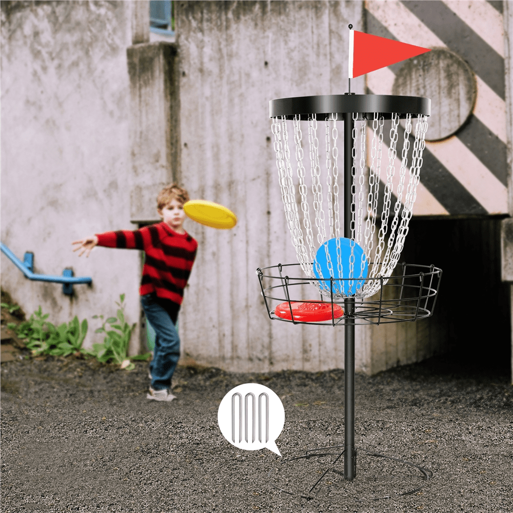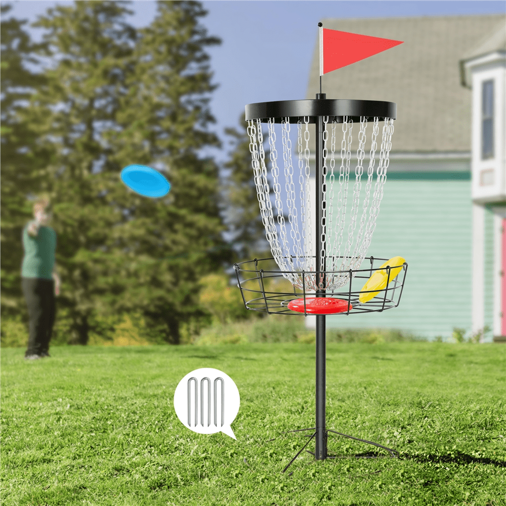 Renwick 24-Chain Disc Golf Basket Flying disc Golf Basket with 3 discs, Black: Color: black Material: steel frame, galvanized steel chains, 600D oxford fabric storage bag Package content: 1 disc golf basket, 1 carrying bag, 3 discs (1 red, 1 blue, 1 yellow), 3 ground stakes, accessory kit Overall dimensions (flag not included): 25.5” L x 25.5” W x 53” H Basket size: 25.5” Dia. x 7’’ H Base diameter: 22’’ Ground clearance: 24’’ N.W.: 26.4 lb G.W.: 31.6 lb Please allow a 0.5” measurement tolerance. Assembly Required Residential Use