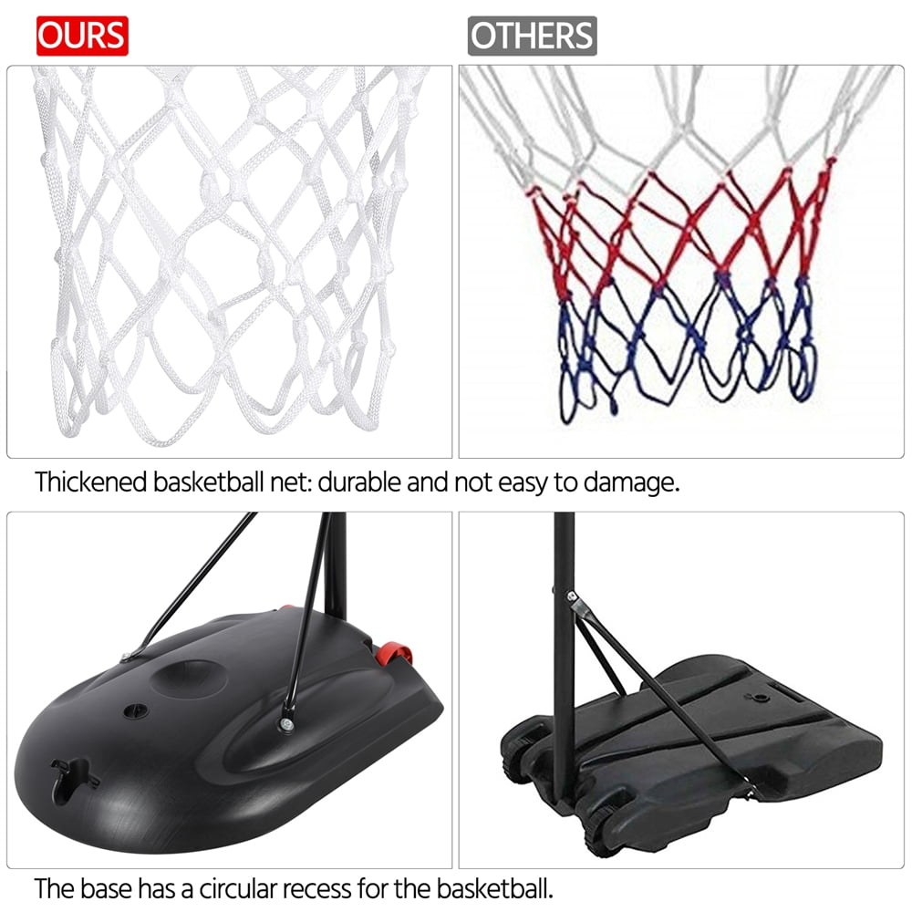 Constructed of high-impact polyethylene plastic backboard and base, the basketball hoop is supported by a water-resistant powder-coated metal stand for improved strength and durability. This basketball hoop can actually “grow” with your little athletes! The telescoping height rim adjustment allows for a range of 5.6ft to 7.5ft in 4.7” increments. With the height adjustment, the portable hoops will be good practicing equipment for younger players who are continually growing. With the help of the mobile base, you can move the portable basketball hoop to the poolside, backyard, basement, gym and other indoor or outdoor places without much effort.