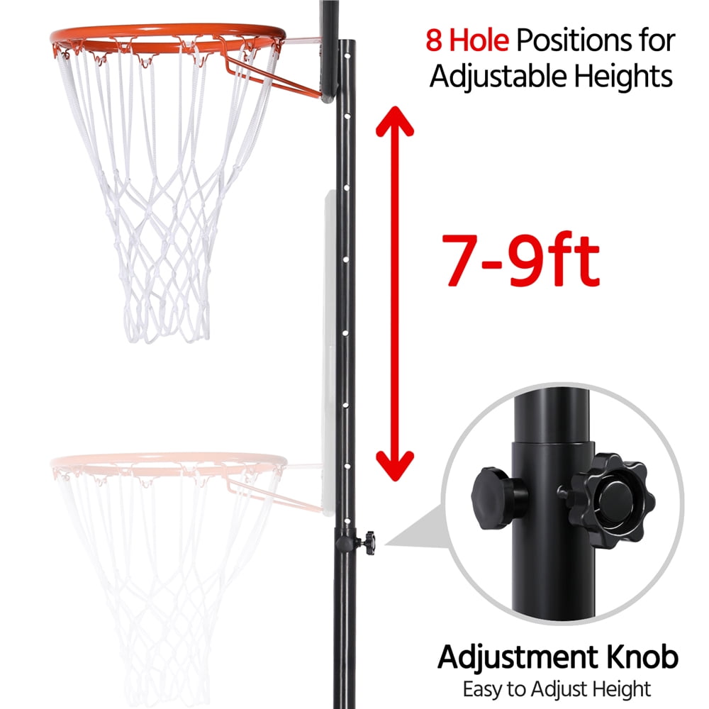 Renwick 32” Youth Portable Basketball Hoop System for Outdoors, Black: Color: black and red backboard, black stand Material: painted steel, PE, PVC Overall dimension:32.5” L x 20” W x 85.5”-109” H/ 2.7ft L x 1.8ft W x 7ft-9ft H Rim diameter:16.3” Rim height adjustment: incremental 5.6-7.5ft Backboard size: 32” L x 20” W Pole diameter: 2” Base size: 32.5” L x 20” W x 6” H Maximum base size (filled with water): 8.7-gallon G.W.:24.7lb Weather-resistant materials Height adjustable Effortless portable design Sturdy weight base Shatter-proof Backboard Reinforced Hoop Rim Height Adjustable Stable Structure Free to Move Suitable for indoor/outdoor use Assembly Required Adjustable Height