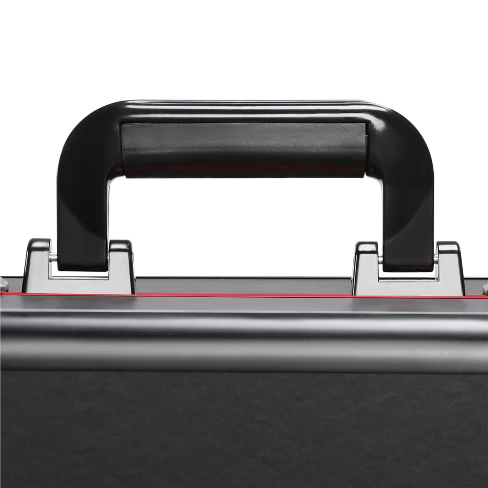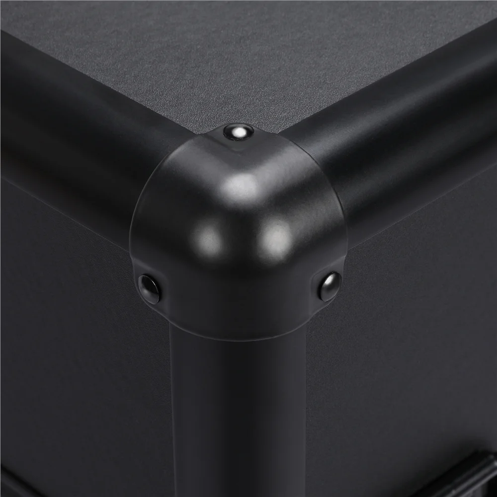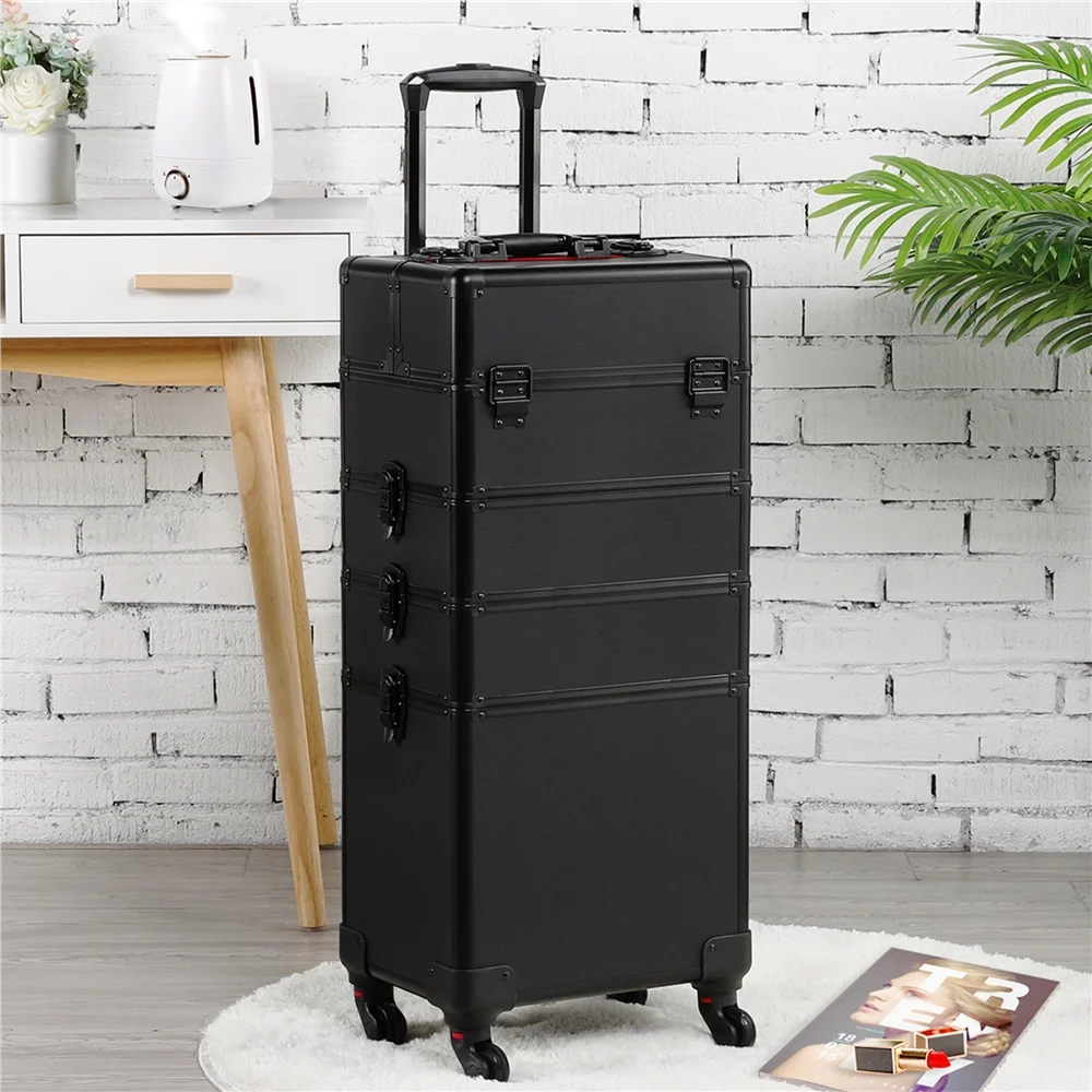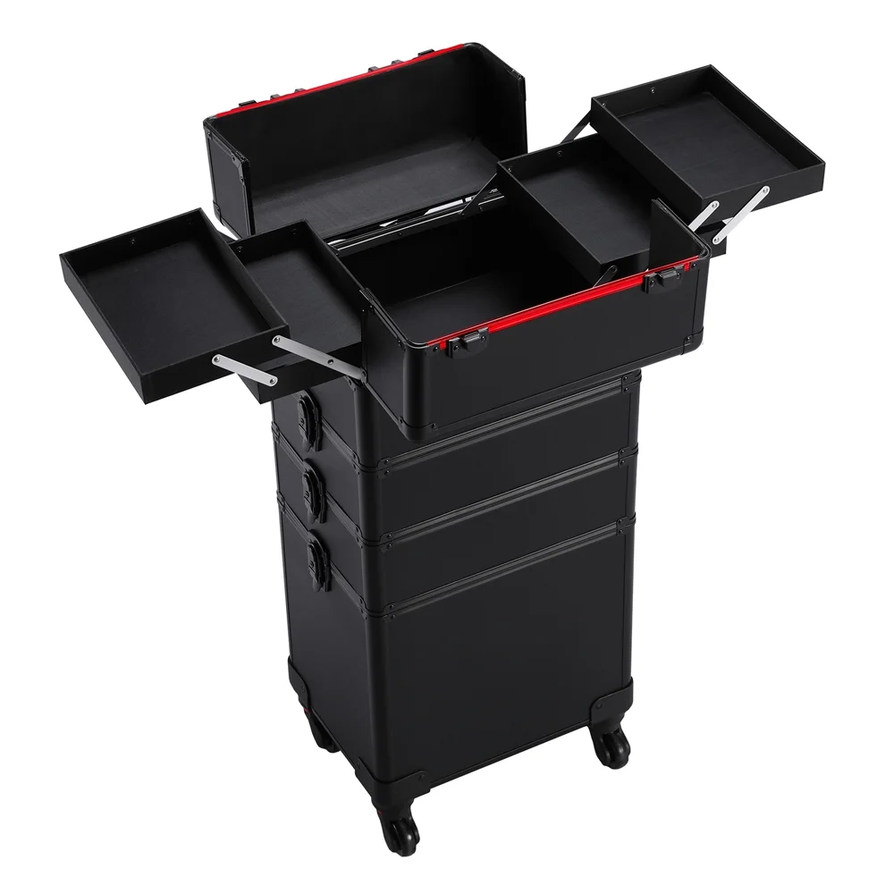 * Specifications: Material: PVC veneer & aluminum edge & MDF case & 210D polyester lining & aluminum pull rod & plastic wheel & metal hardware Case dimension (wheel height included):13.4 x 10 x 31.7″(LxWxH) Retractable handle height: 17-39.5″ Top case size: 13.4 x 9.8 x 8.9″(LxWxH) Accordion-style tray size: 9 x 6.2 x 1.4″(LxWxH) Middle drawer size (Each): 13.4 x 9.8 x 4.1″(LxWxH) Bottom Compartment Size: 13.4 x 9.8 x 11.8″(LxWxH) Detachable tray size: 12 x 9 x 3.2″(LxWxH) Brush bag size: 9.8 x 9.8″(LxW) Max. load capacity: 66 lb G.W.: 20.2 lb N.W.: 16.1 lb Color: black & red * Please Note: 1. Cosmetics/hair & Cosmetic tools are not included in this item. 2. Note: Please allow errors due to manual measurements.