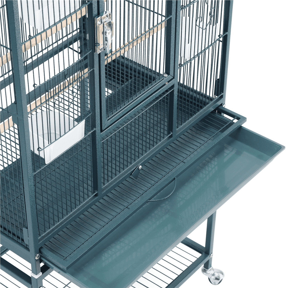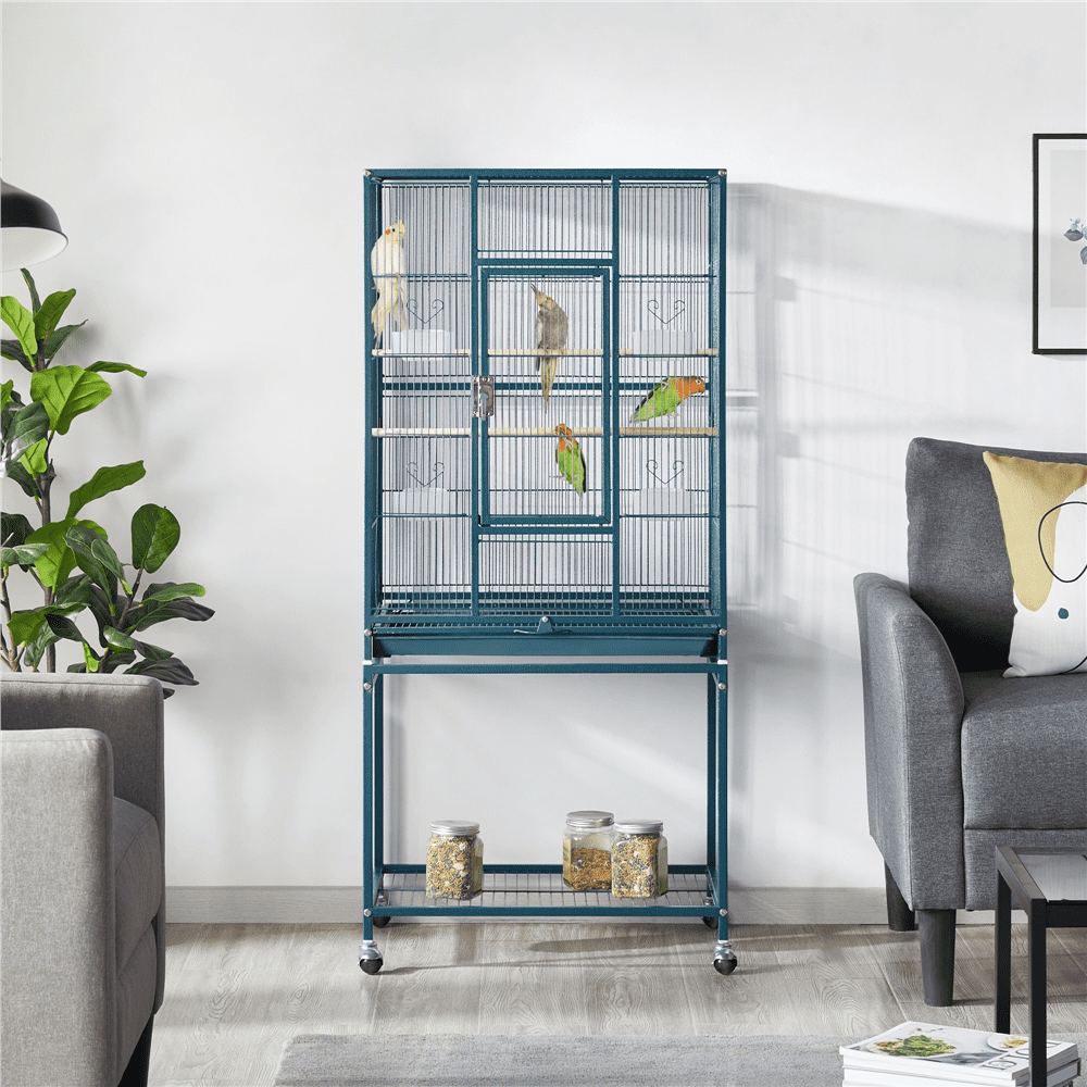 The spacious inner cage area can accommodate multiple small to medium-sized birds, including lovebirds, conures, parakeets, budgies, and cockatiels. This provides them with a comfortable and expansive space to thrive. The cage is fitted with 3/8″ bar spacing, which ensures the safety of your small pets. Furthermore, this cage can also serve as a home for small animals such as sugar gliders, rats, and squirrels. The pet cage is user-friendly, and it comes with a detachable rolling stand for added mobility and storage space. The cage and stand can be used separately according to the user’s needs. This parrot cage is straightforward to clean and assemble thanks to its simple structure and thoughtful designs, which make the cleaning process more efficient. It is a simple assembly process.