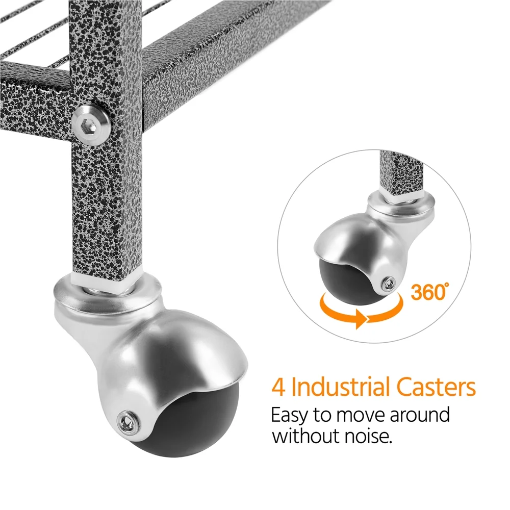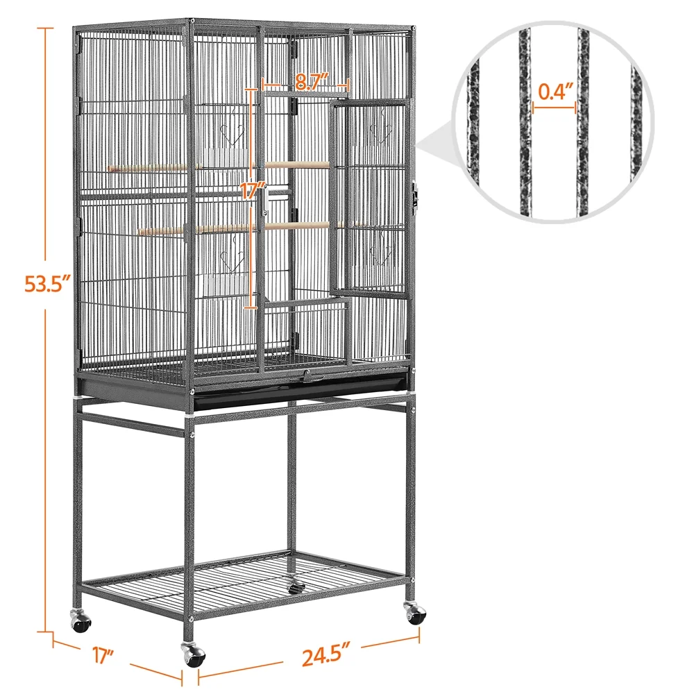 53.7” Metal Rolling Bird Cage with Stand, 4 Feeding Bowls, and 2 Perches, Black: Color: Hammertone Black Material: Iron & Steel & Rubber Caster & HIPS Plastic Tray Overall Dimension:25.8 x 16.7 x 53.7”(LxWxH) Cage Size:24.2 x 16.5 x 30”(LxWxH) Large Front Entrance Size:8.9 x 17.3”(WxH) Feeder Door Size:3.1 x 4.9”(WxH) Tray Size:23 x 16.3 x 1.5”(LxWxH) Storage Shelf Size:24.4 x 16.7”(LxW) Rolling Rack Size:25.8 x 16.7 x 23”(LxWxH) Bar Spacing:0.4” Perch Size:24.2 x 0.7”(LxDia.) G.W.:31.2 lb N.W.:27.1 lb Package Size:35.4 x 26 x 4.7”(LxWxH) Max. Load Capacity: Cage: 33 lb Storage Shelf:22 lb Free Accessory: 4 x Feeding Bowls and 2 x Perches Please Note: Please notice that the color of this bird cage is not pure black. It is in hammertone black. Not to be used for transport Package includes: 1 x Large Pet Cage and 1 x Instruction