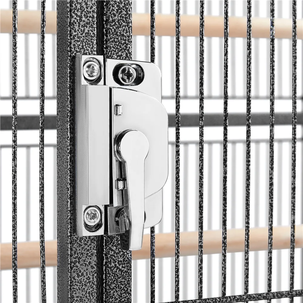 The spacious cage is able to house several small birds comfortably. It is suitable for families with more than one small or medium birds. It is also a great home for sugar gliders, chinchilla and other small animals. The front door is secured with a crescent lock to prevent your birds from opening the doors and keep them safe in the cage. There is a special arc-shaped wire on each small door for locking, making the door impossible for birds to unlock themselves. Our parrot cage comes with a stand that sits on four 360 degree swivel smooth rolling casters. The detachable mobile stand can be easily removed if needed. A slide-out tray under the cage can be removed and cleaned with water. A grate between pets and the tray prevents your pets from walking on their droppings. Four feeding bowls and two perches are included with purchase.