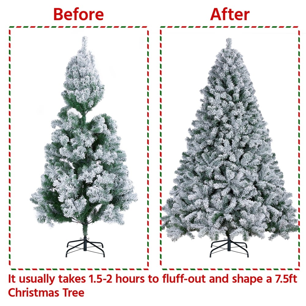 *Renwick 7.5’ Frosted Artificial Christmas Tree with Stand, Green: Materials: PVC, Iron Type: Unlit Flocked Spruce Total Tips Count: 1284 Color: Green Overall Dimension:55×88.6″ (Dia.× H) Stand Dimension: 22×6.7″ (Dia.× H) Tree Trunk Diameter: 1.3” Trunk Pole Thickness: 0.03″ G.W.:39lb *Note: Please allow ±1.2″ measurement error due to the bendable branch tips. Please allow ±1.1lb measurement error Residential Use Assembly Required