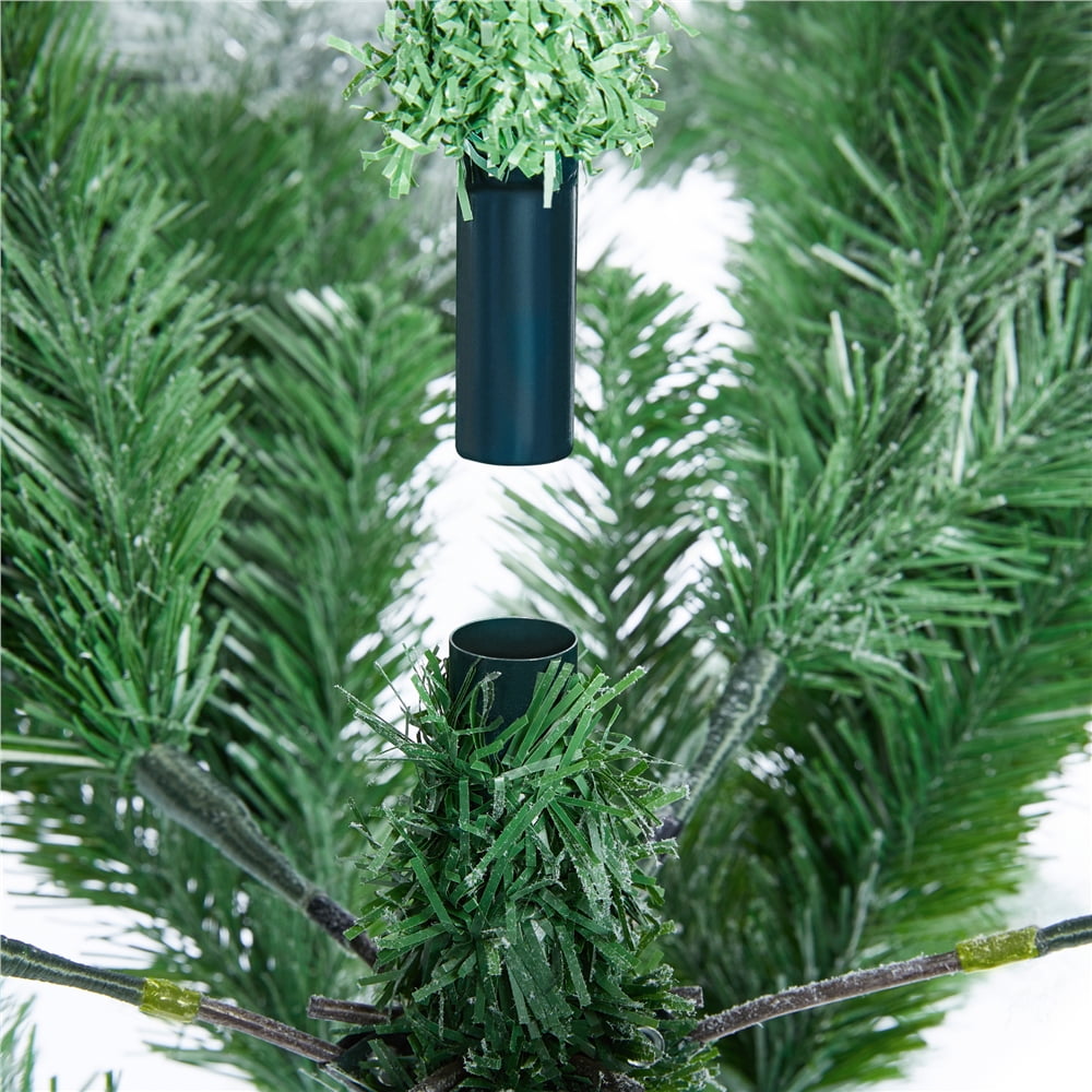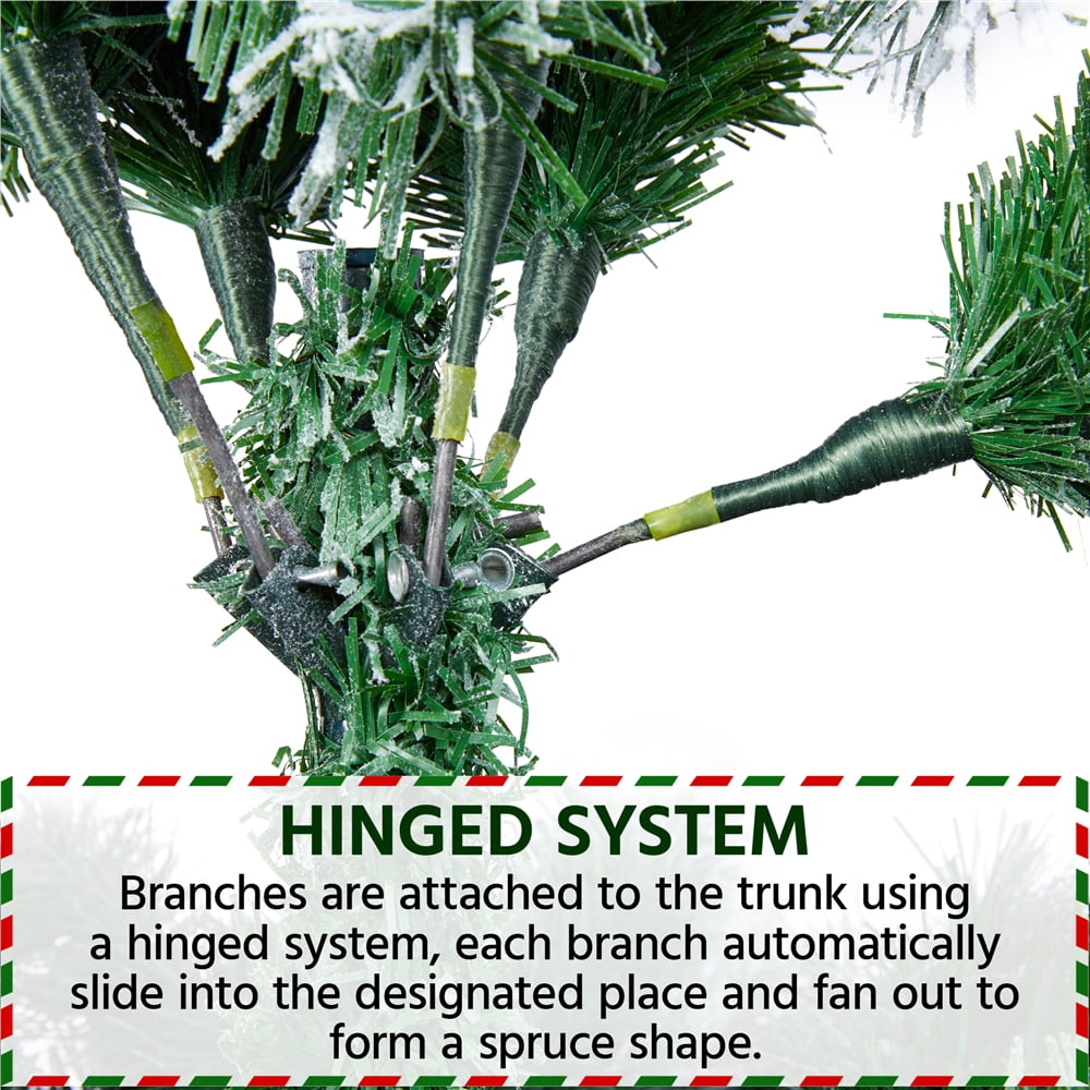 Our snow dusted artificial Christmas tree is made of premium quality materials, including fire-resistant PVC branches and tips covered with white flocking snow, making it classic and traditional. The branches are bendable and can be set in certain directions. A foldable metal stand keeps the tree in place. The tree body is divided into three sections for easy assembly. The branches are bendable and can be set in certain directions. Nicely bent the tips and fluff out the “leaves”, it is time to enjoy decorating your own Christmas tree with the whole family!