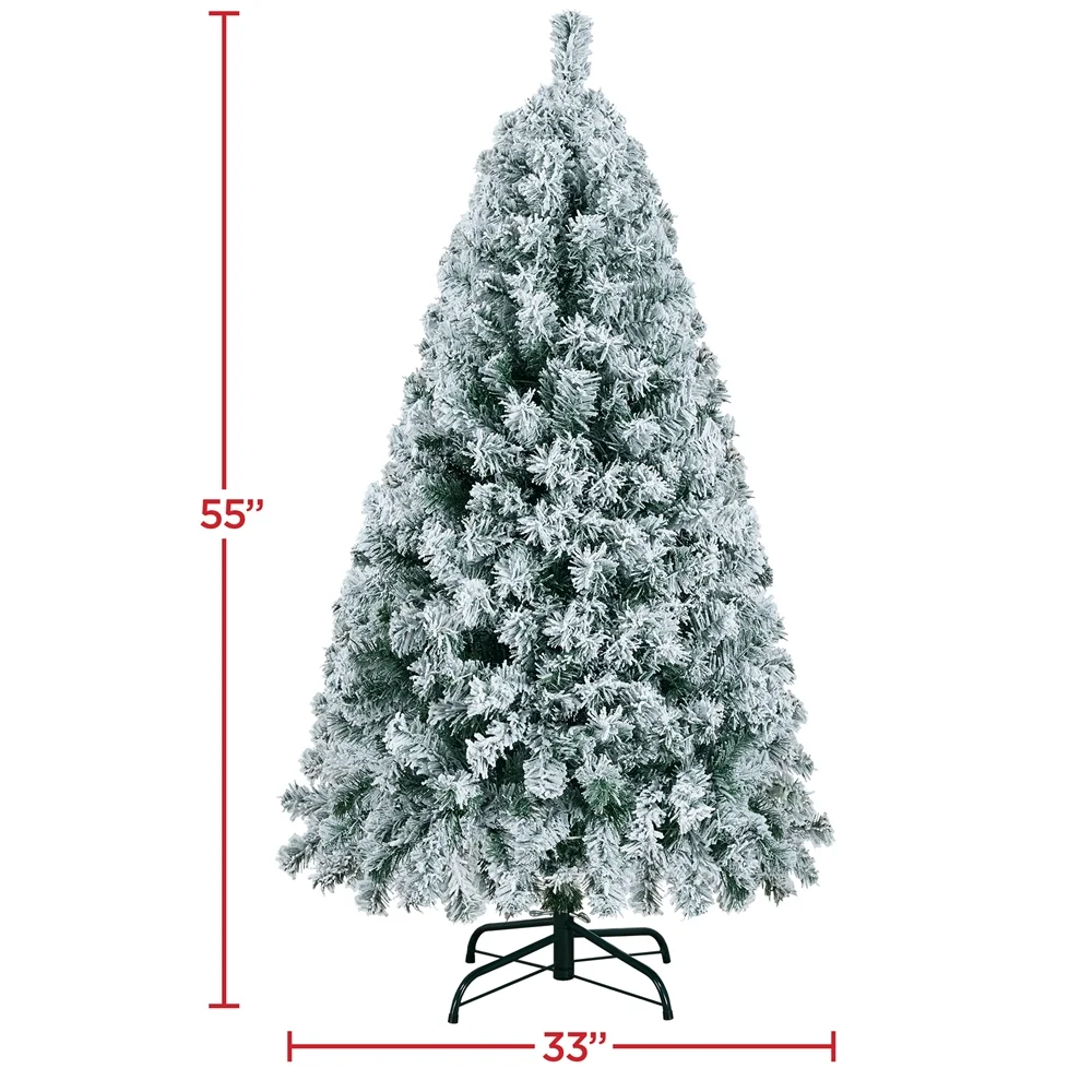 Easyfashion 4. 5 Ft Snow Frosted Christmas Tree Warm Lights, Green. Our frosted artificial Christmas tree comes with premium quality materials, for both fire-resistant and nice durability. PVC branches and tips are covered with white flocking snow, making it classic and traditional. A hinged system is easy to assemble with pre-fixed lights and branch position. A foldable stand can be placed and stored with less space taken.