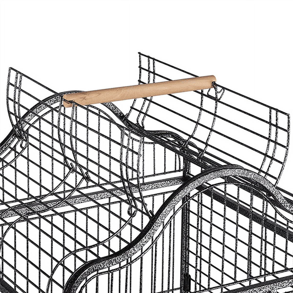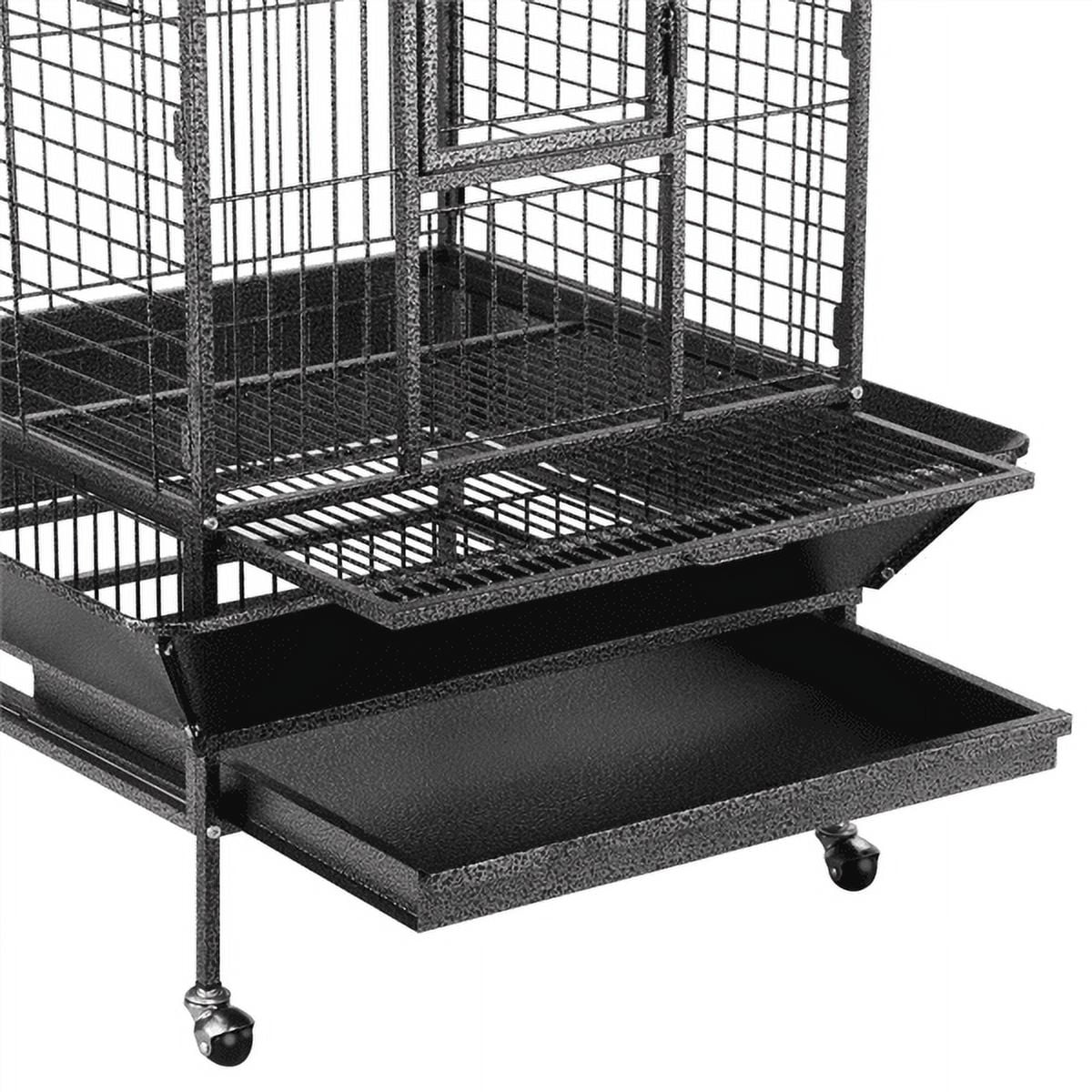 Extra Large Bird Cage with Rolling Stand, 3 Feeding Bowls and 2 Perches, Black: Material: Iron, Stainless Steel Feeder, PP Caster, Wooden Perch Overall Dimension(when roof opened): 32 x 30.3 x 63”(WxDxH) Overall Dimension(when roof closed): 32 x 30.3 x 61”(WxDxH) Cage Size: 24 x 22 x 44.5”(WxDxH) Front Door Size: 18.3 x 9”(LxW) Feeder Door Size: 5.9 x 4.7”(LxW) Top Opening Size: 12.2 x 20.5”(WxL) Feeder Size: 4.3 x 1.8”(Dia.xD) Bar Spacing: 1” Minimum Wire Diameter: 0.14” G.W.: 55.2 lb. N.W.: 48.8 lb. Package Size: 46.5 x 26.4 x 6.3”(LxWxH) Color: Hammertone Black Free Accessory: 3 x Feeding Bowls and 2 x Perches Please Note: Please notice that the color of this bird cage is not pure black. It is in hammertone black Assembly Required Color: Black