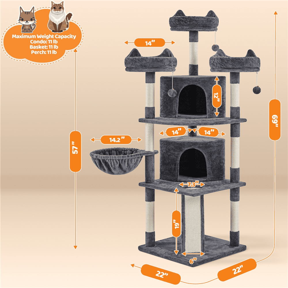 Renwick Large Cat Tree Plush Cat Tower with Caves Condos Platforms Scratching Board, Dark Gray : Material: 1.2cm particleboard, 400G plush Color: Dark Gray Overall size: 22x22x69inch (LxWxH) Diameter of the basket: 14.4inch Scratching board size: 19x6inch (LxW) Condo size: 14x14x12inch (LxWxH) The max. weight capacity of basket/perch/condo: 11lb G.W.: 45lb N.W.: 42lb Please allow ±0.5inch error due to manual measurement. Children are prohibited from climbing and playing on it. Residential Use Assembly required