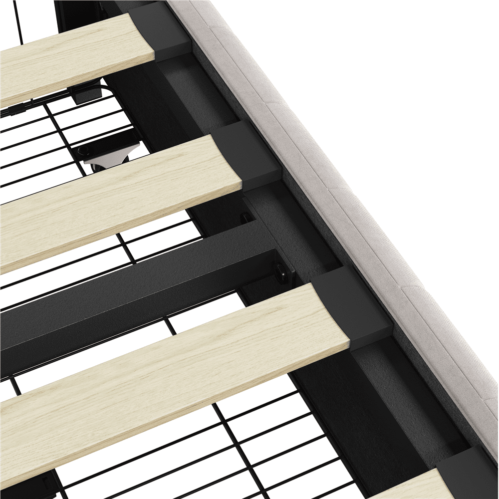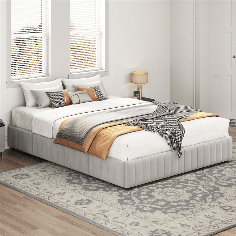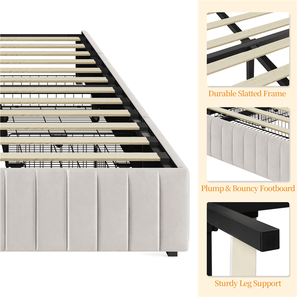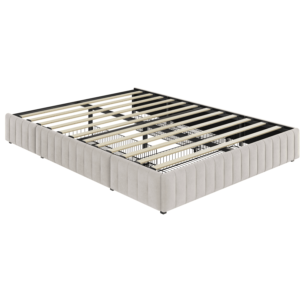 Simple & Modern: Low-profile frame opens up any room. Modern design with a simple color fits various types of home decor. The striped pattern of the side panel combined upholstered bed frame enriches your room with a classic and chic look Without Fixed Headboard: Without fixed headboard design, this upholstered bed frame is easily blended with room decor. That means you can customize your desirable backdrop according to your style Firm Support System: The frame is made from engineered wood and sits on metal legs, designed to support a mattress of your choice, supporting a maximum weight capacity of 800 lb Cushion-padded Side Panel: Thanks to the thick and soft foam-cushioned side panel with a striped pattern, your bedrooms improve a sense of soft-to-touch feeling and a fresh look, upgrading to the next level Easy Assembly Required: With the help of step-by-step assembly instructions and the included tools, two adults can finish the setup within an hour Specifications: Color: Beige; Slat Quantity: 12; Materials: Poplar Wood, Particle Board, Metal, Foam, Velvet Fabric; Assembled Dimensions: 82 ″ L × 63.5 ″ W × 11.5 ″ H; Maximum Weight Capacity: Total: 800 lb