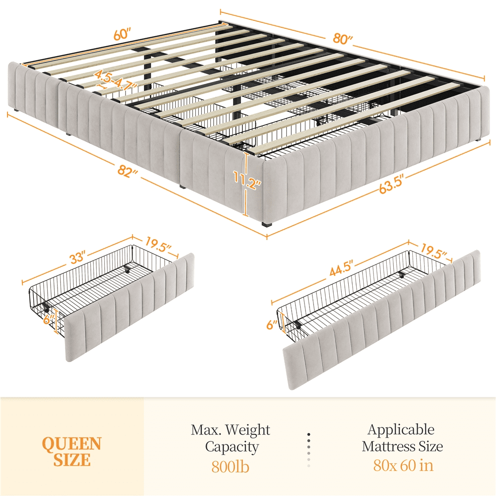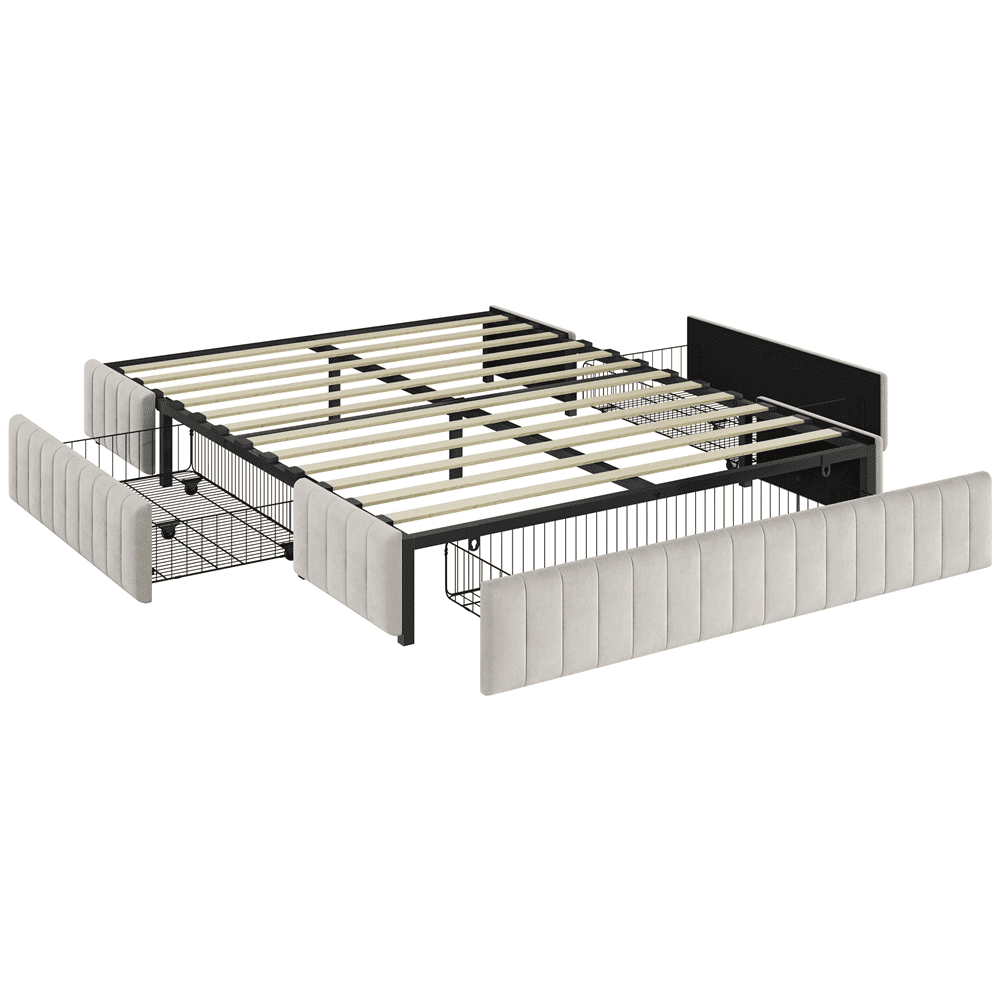 Renwick Queen Size Upholstered Bed Frame with 4 Storage Drawers for Adult, Beige