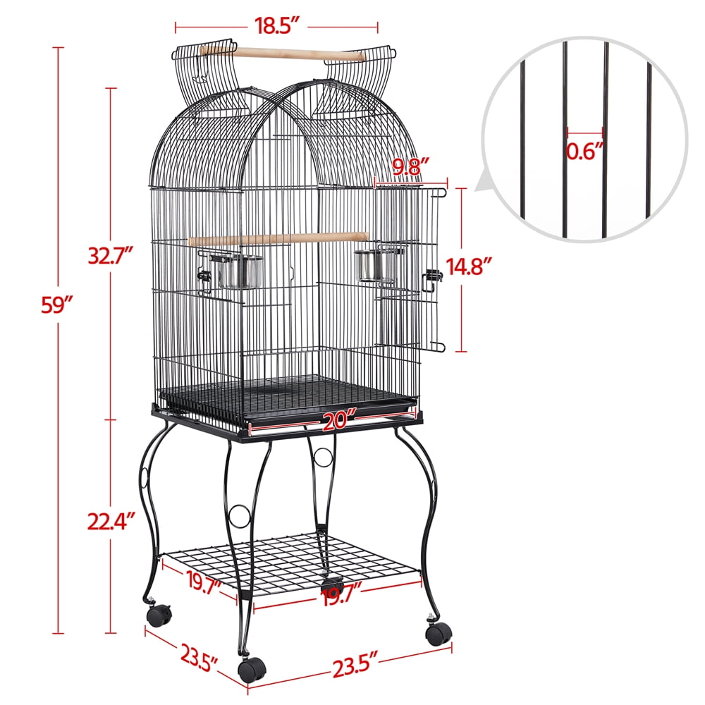 Material: Painted metal, PP plastic, ABS plastic, stainless steel, wood Overall dimension (with top open): 23.5×23.5x59inch (LXWXH) Cage size (with top closed): 20x20x32.7inch (LXWXH) Bar spacing: 0.6inch Door size: 14.8×9.8inch (LXW) Rolling stand size: 23.5×23.5×22.4inch (LXWXH) Storage shelf size: 19.7×19.7inch (LXW) Free accessory: 2 stainless steel feeders, 2 wooden perches G. W.: 26.9lb Color: Black.