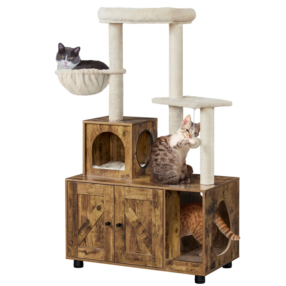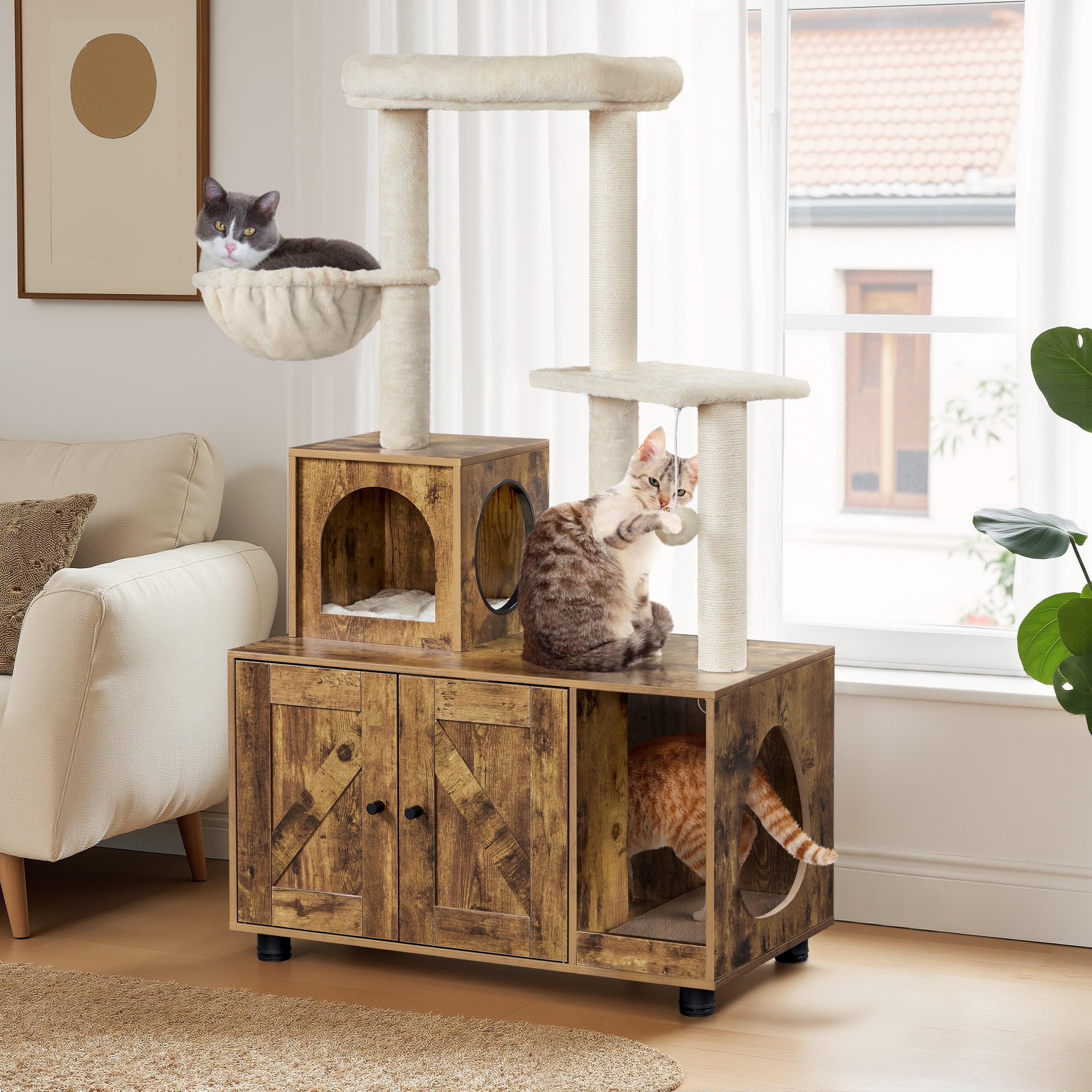 Renwick 53” Wooden Litter Box Enclosure with Cat Tree Tower, Rustic Brown/Beige