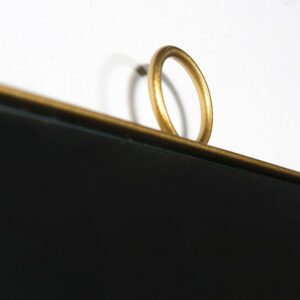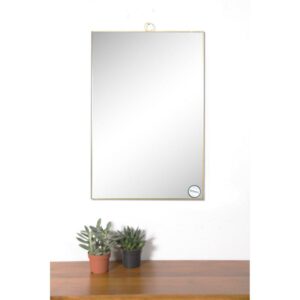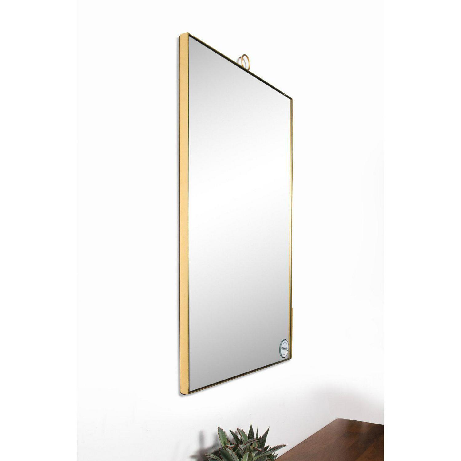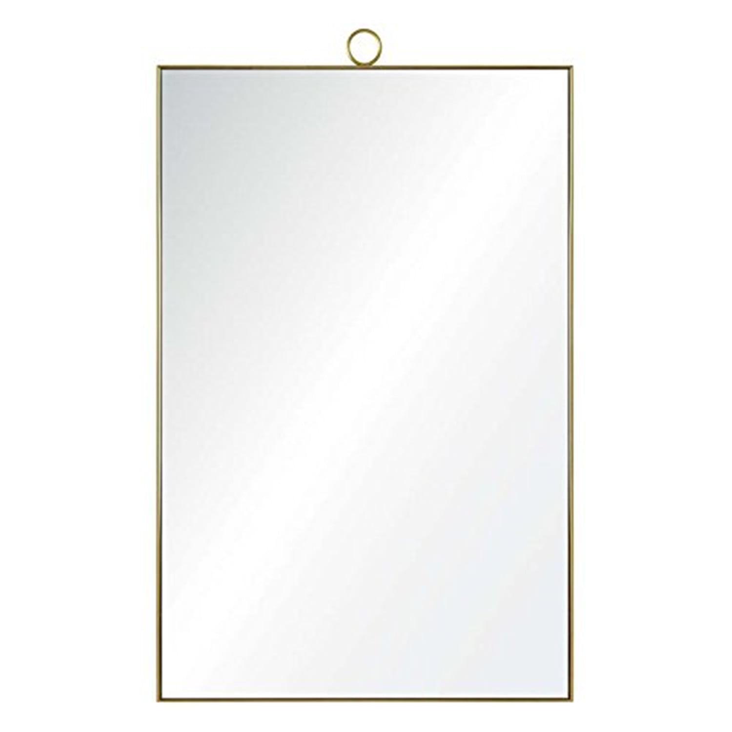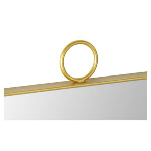 Includes hanging hardware. Rectangular shape. Bevelled. Can be hang vertically and horizontally. Framed. Made from metal. Brass finish. Made in China. Frame width: 0.1 in.. Mirror: 23 in. W x 37 in. H. Overall: 24 in. W x 1 in. D x 38 in. H (22 lbs.). The simple sophistication of a single loop defines the elegant design of this modern wall mirror. The thin brass mirror frame features an ornamental circle at the top center of the looking glass for an understated look that never goes out of style. The delicate embellishment is everything you need to dress up the walls behind a bathroom vanity or dressing table.