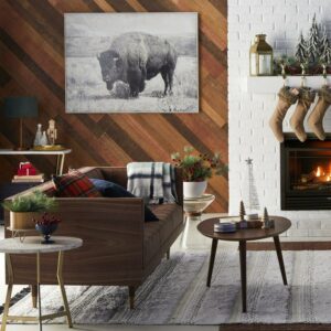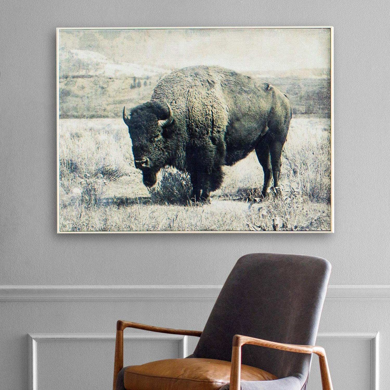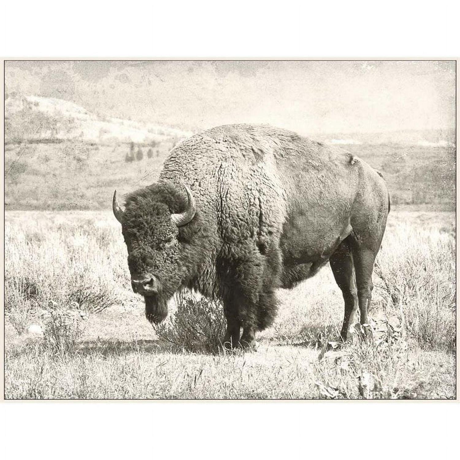 A sepia-toned art print of a wild buffalo brings the rugged terrain of the Old West to refined interior walls. Painted accents capture the animal grazing in his natural habitat, accentuating dry desert brush and arid mountainside in lifelike detail. Surrounded by a low profile frame in a cream finish, the rustic nature of this decorative canvas art piece reflects the beauty of fine art photography as it captures beauty in every environment.
