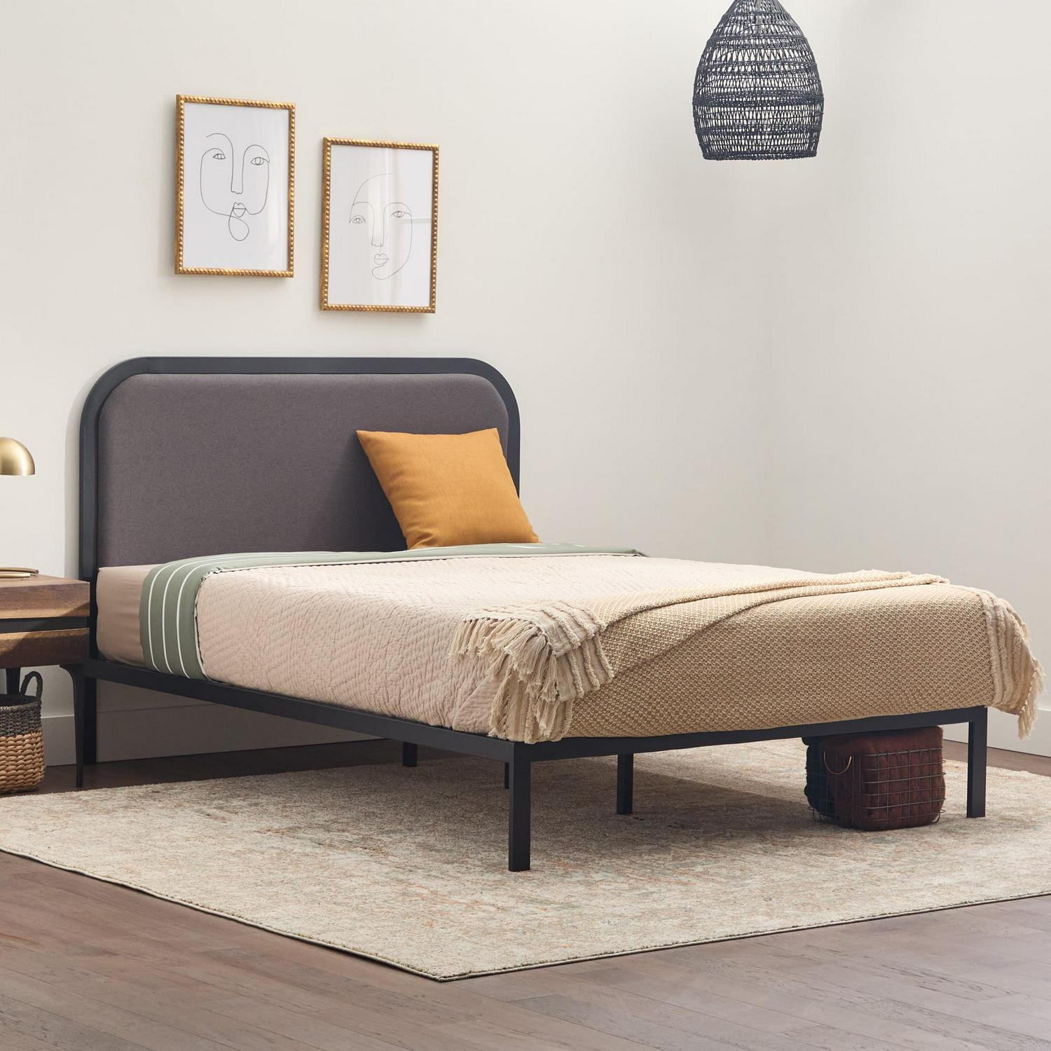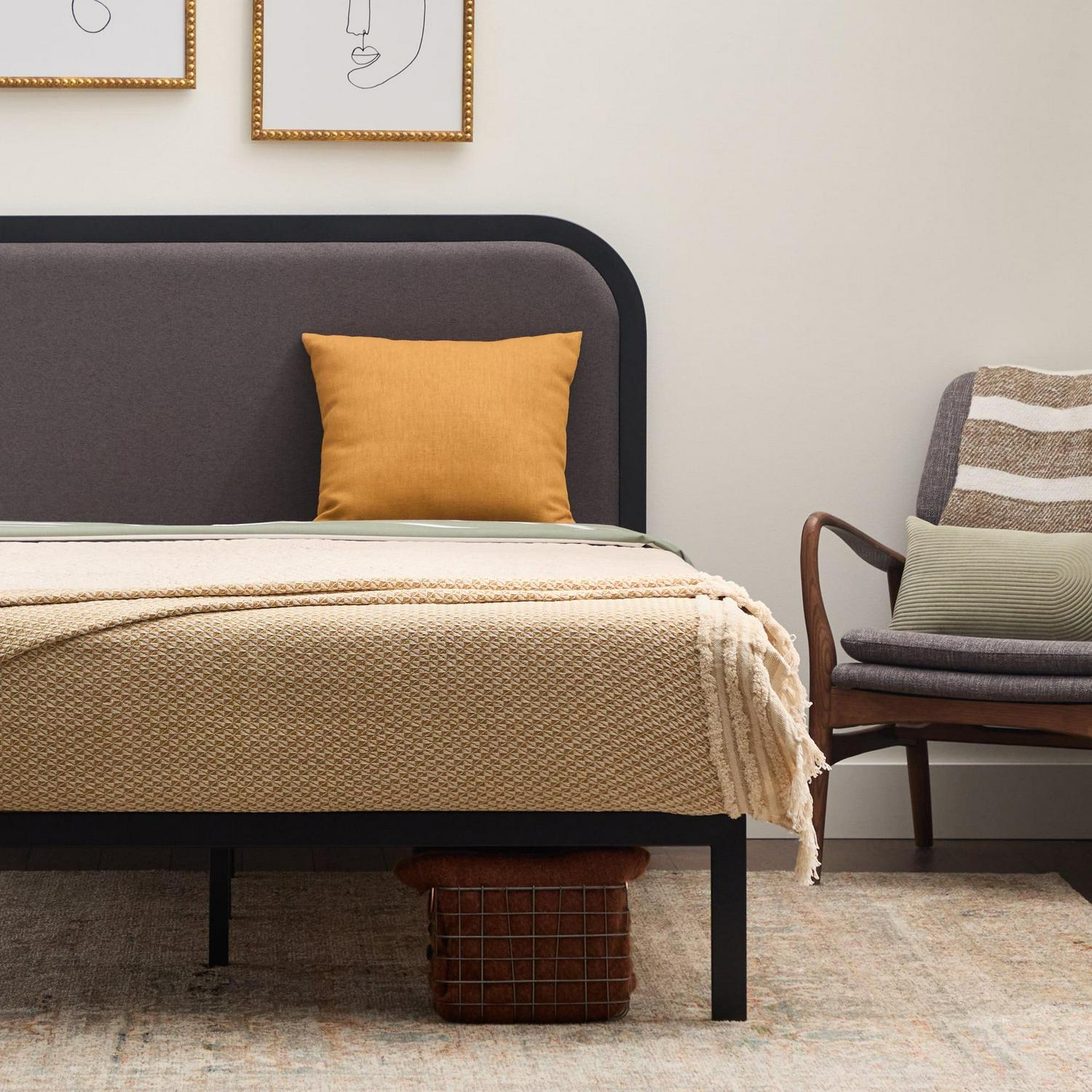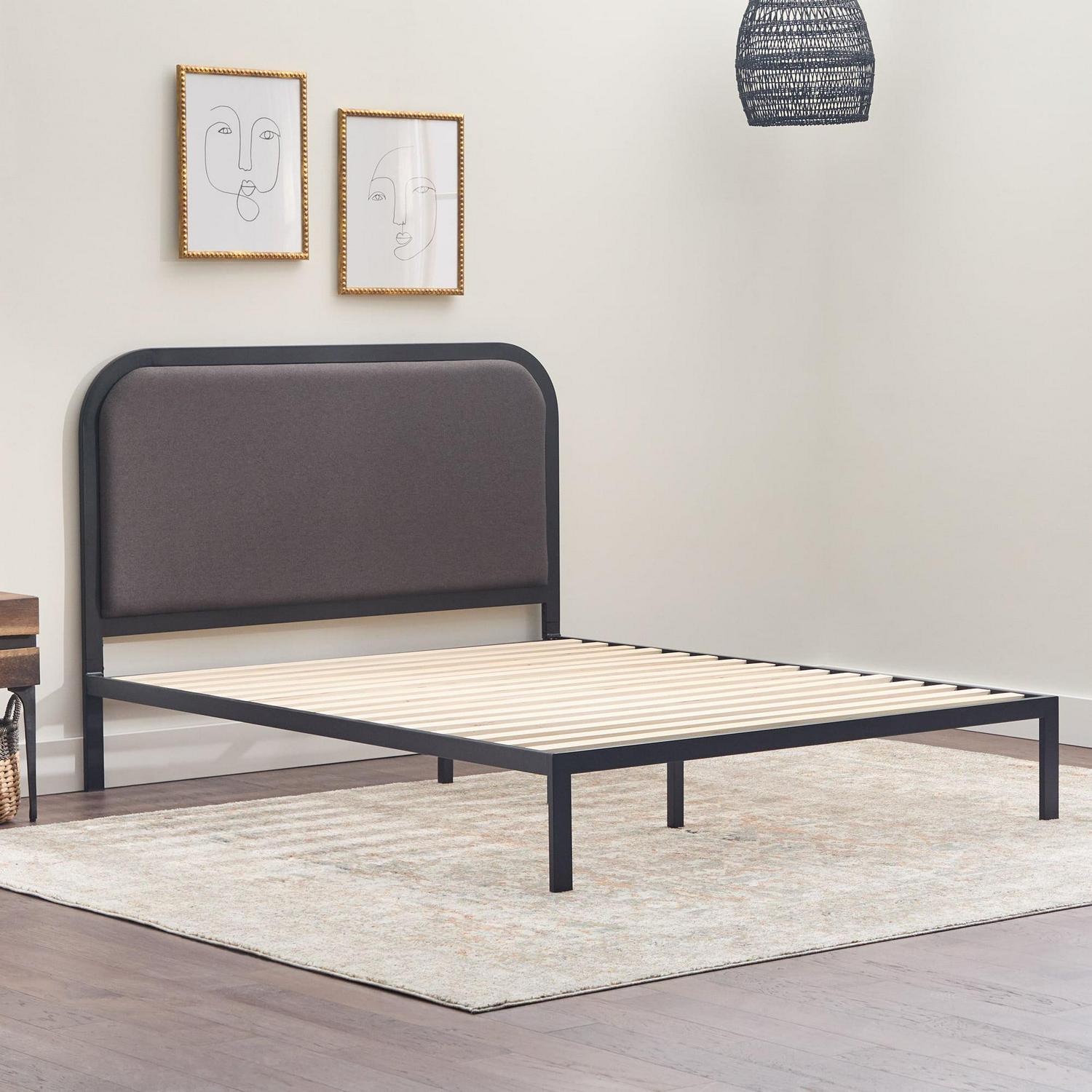 Rest Haven Salem Metal Platform Bed with Rounded Upholstered Headboard, Twin, Charcoal: